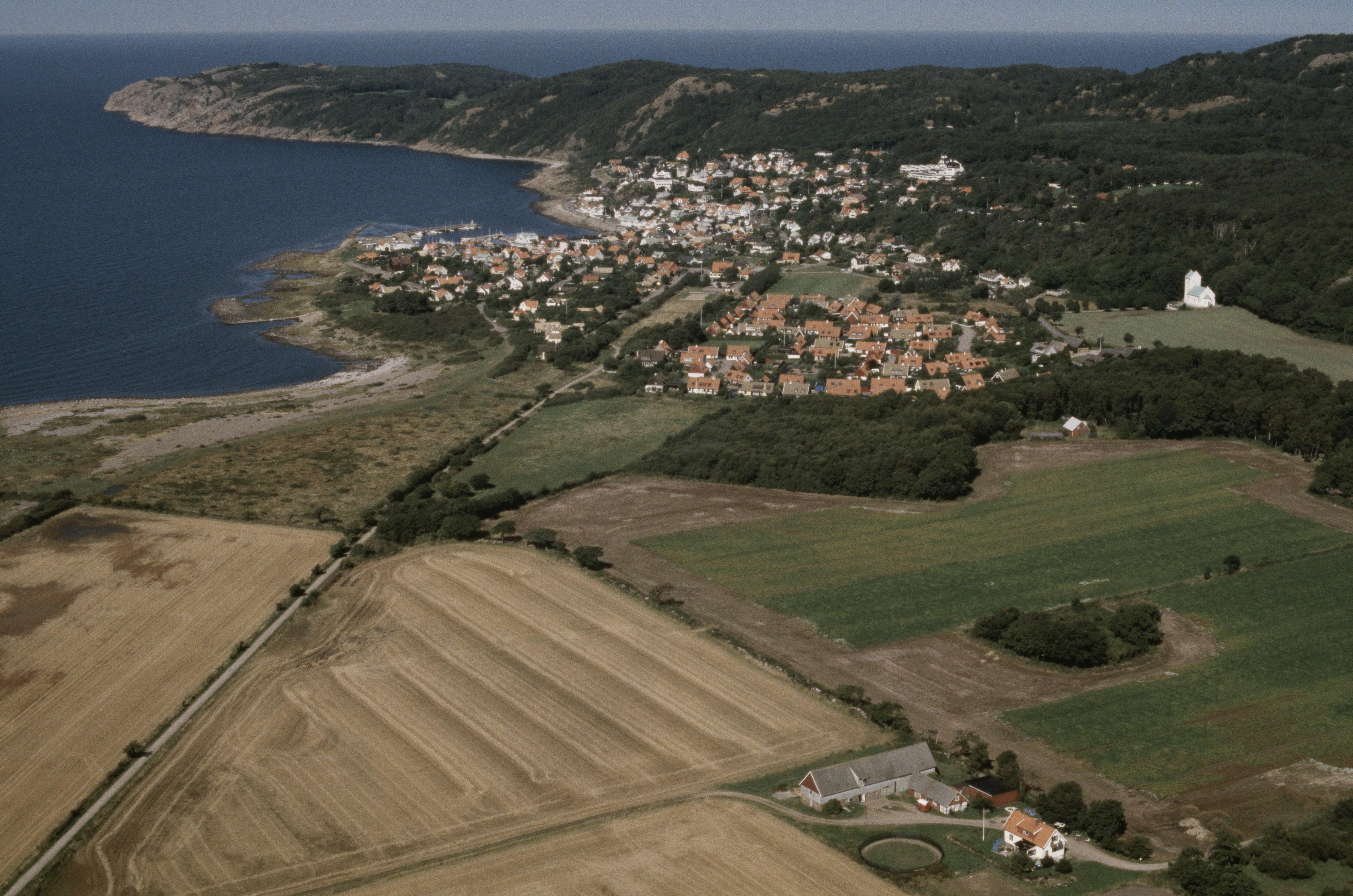 Beskrivning: Kullaberg. Mölle tätort. Mölle kapell till höger om bildens mitt. I bildens övre del Kullaberg. Bilden är tagen mot (väderstreck): NV