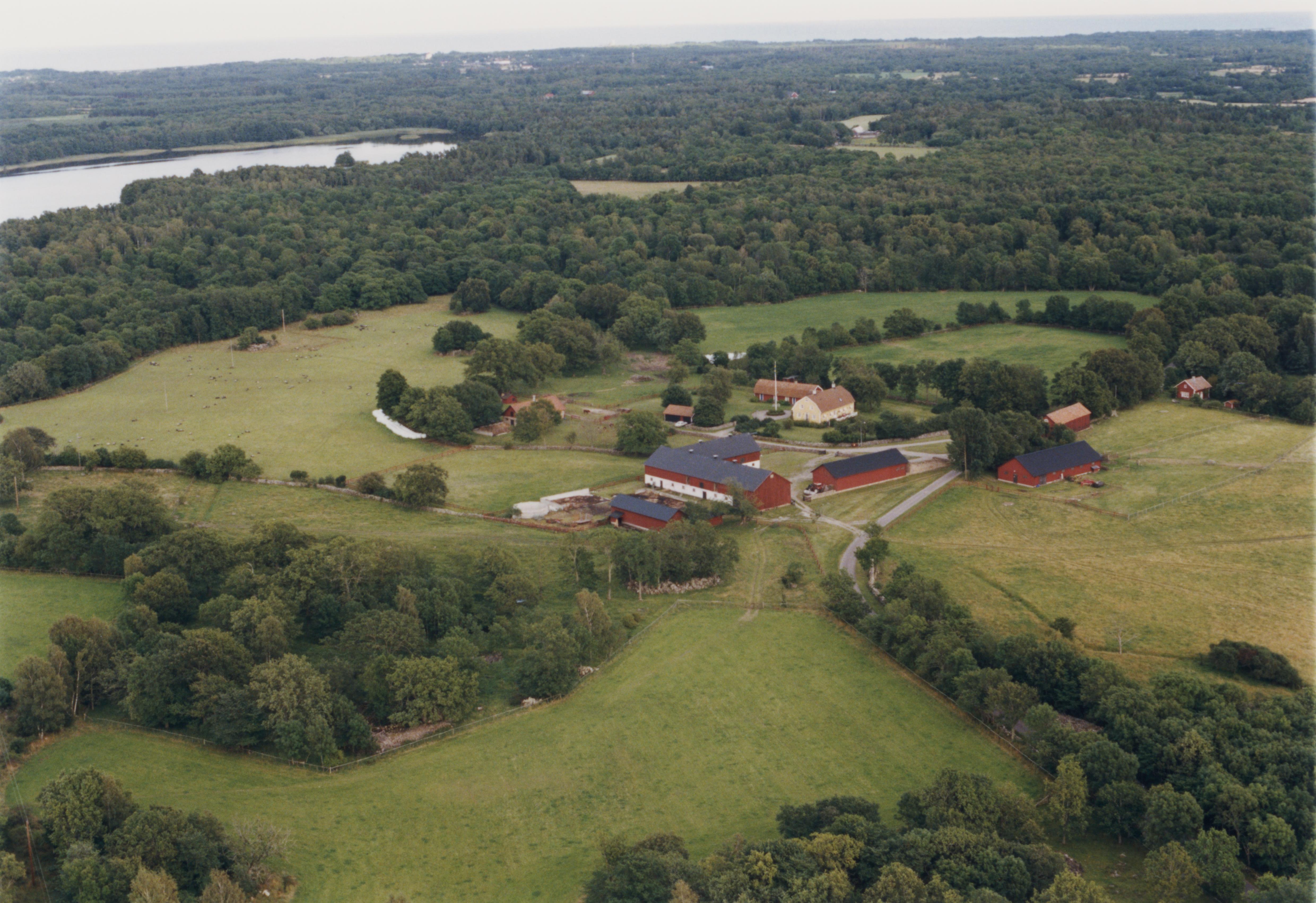 Beskrivning: Horns herrgård / Horns säteri / Horns kungsgård. Över bildens mitt område med hägnad RAÄnr Högby 40:1-2. Bilden är tagen mot (väderstreck): SO