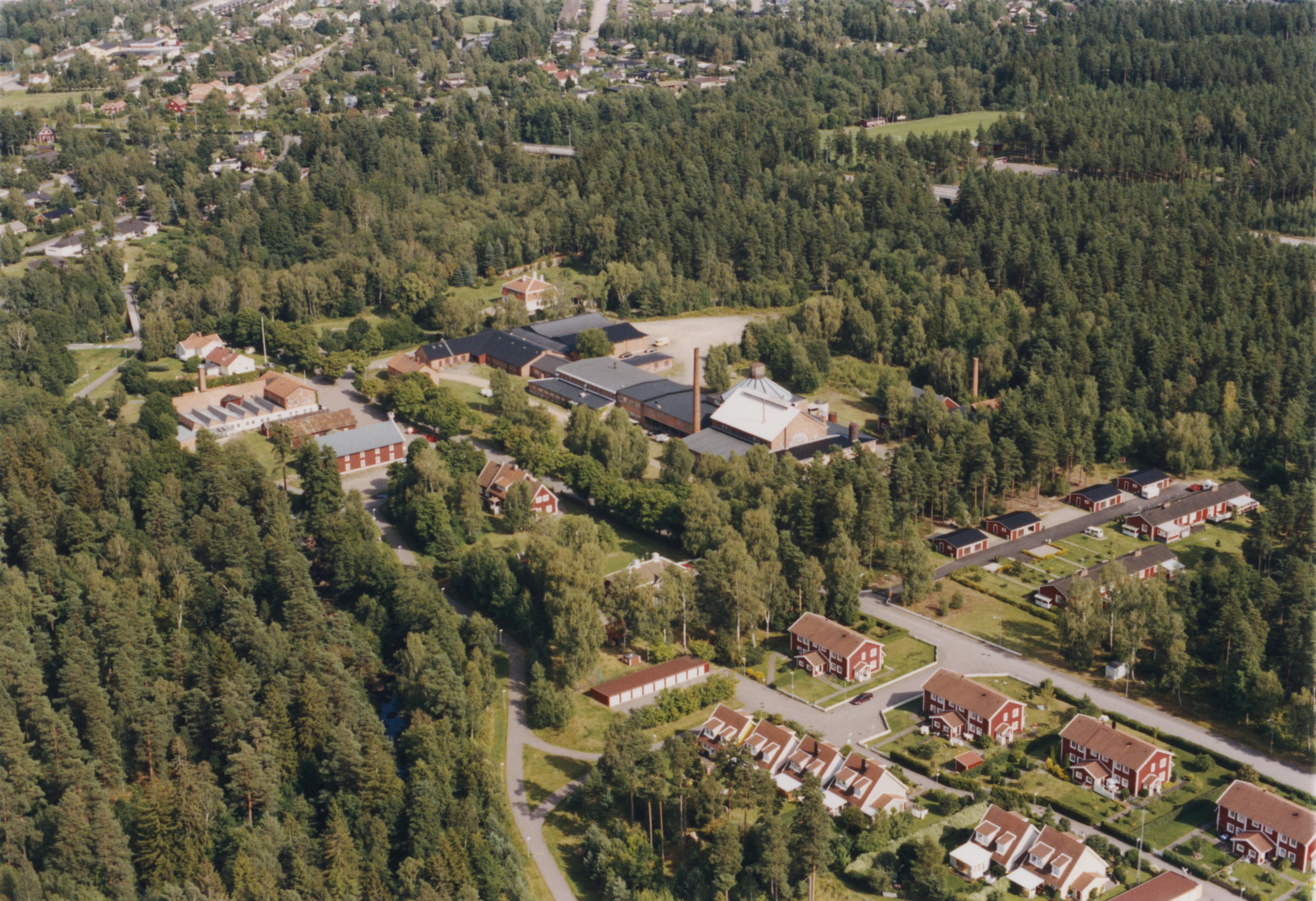 Beskrivning: Pukebergs bruk / Pukebergs glasbruk RAÄnr Madesjö 196:1 vid Sankt Sigfridsån som markerar gränsen mellan socknen Madesjö och Nybro. Nybro tätort i bildens övre del. Bilden är tagen mot (väderstreck): Ö