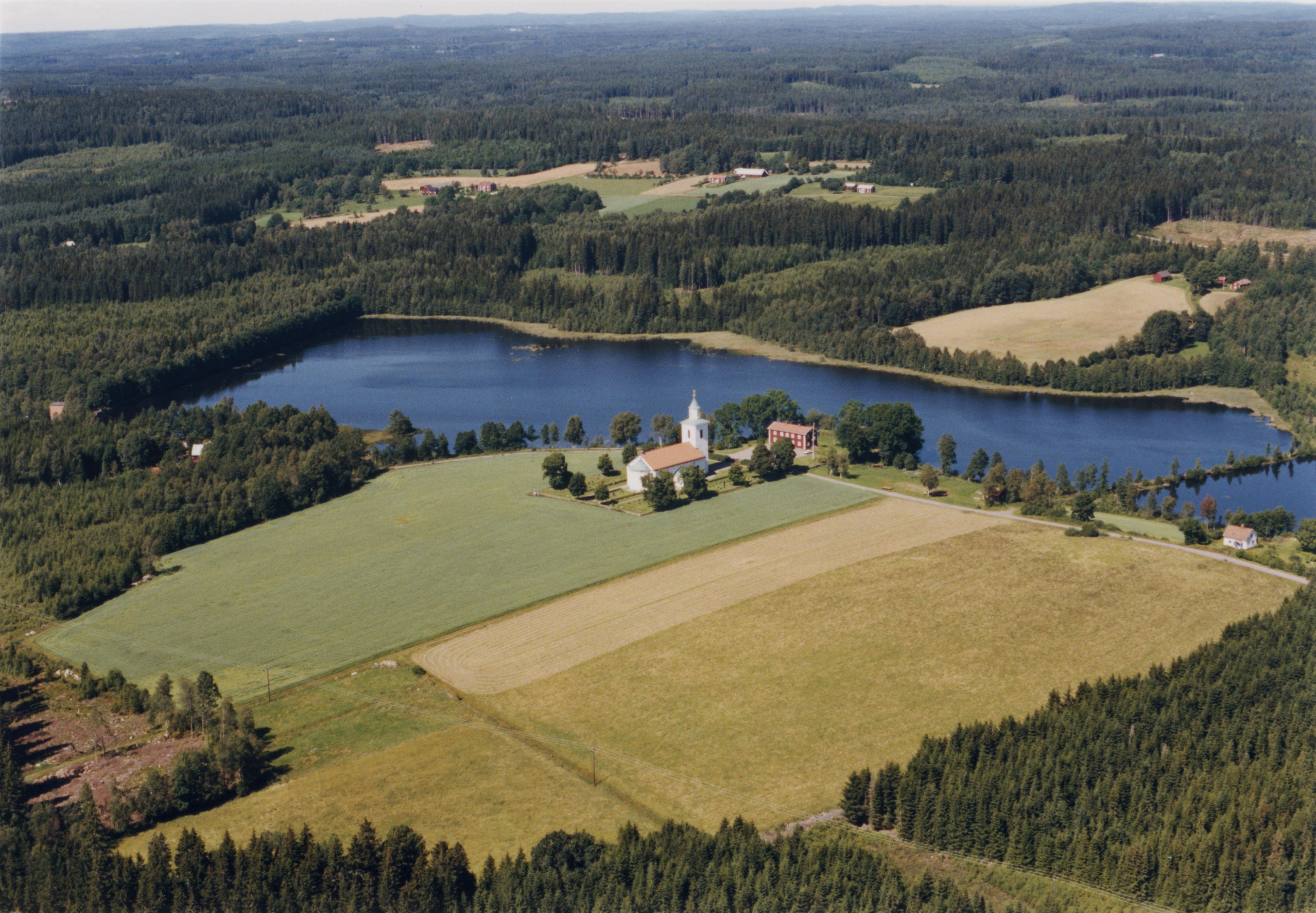 Beskrivning: Drevs och Hornaryds Nya kyrka vid Mörrumsån. Vid kyrkan bytomt RAÄnr Drev 88:1. Bilden är tagen mot (väderstreck): NV