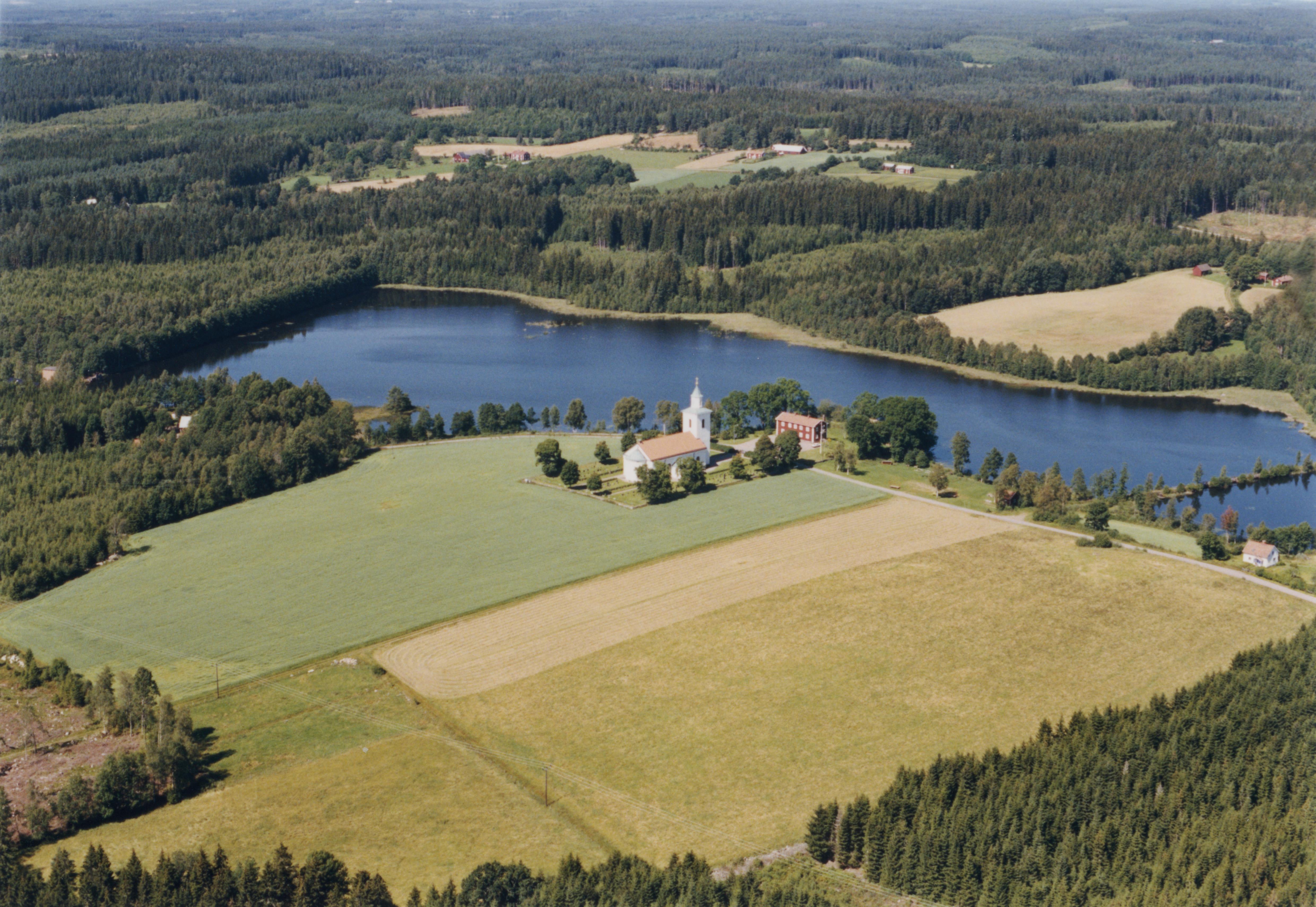 Beskrivning: Drevs och Hornaryds Nya kyrka vid Mörrumsån. Vid kyrkan bytomt RAÄnr Drev 88:1. Bilden är tagen mot (väderstreck): NV