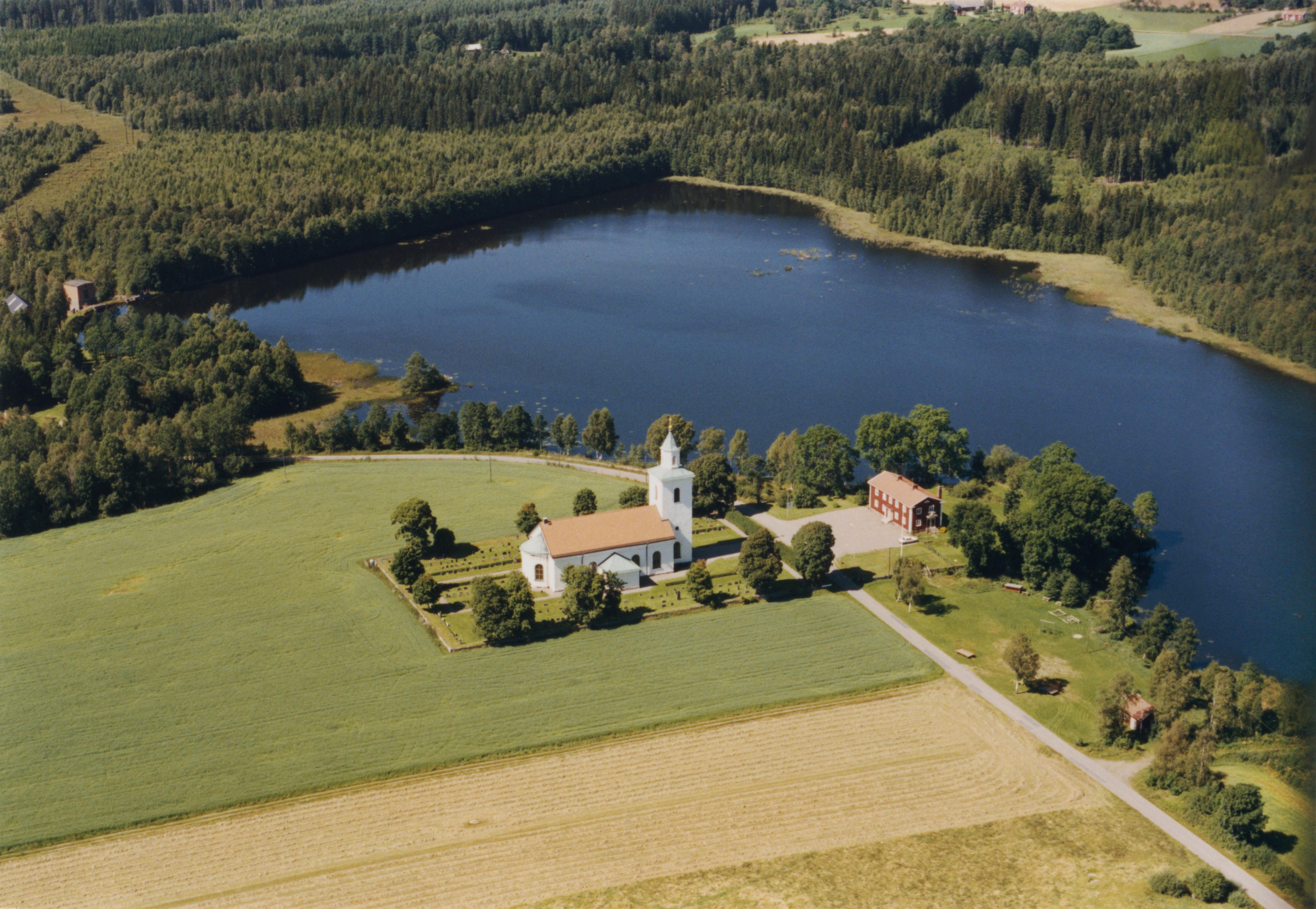 Beskrivning: Drevs och Hornaryds Nya kyrka vid Mörrumsån. Vid kyrkan bytomt RAÄnr Drev 88:1. Bilden är tagen mot (väderstreck): V