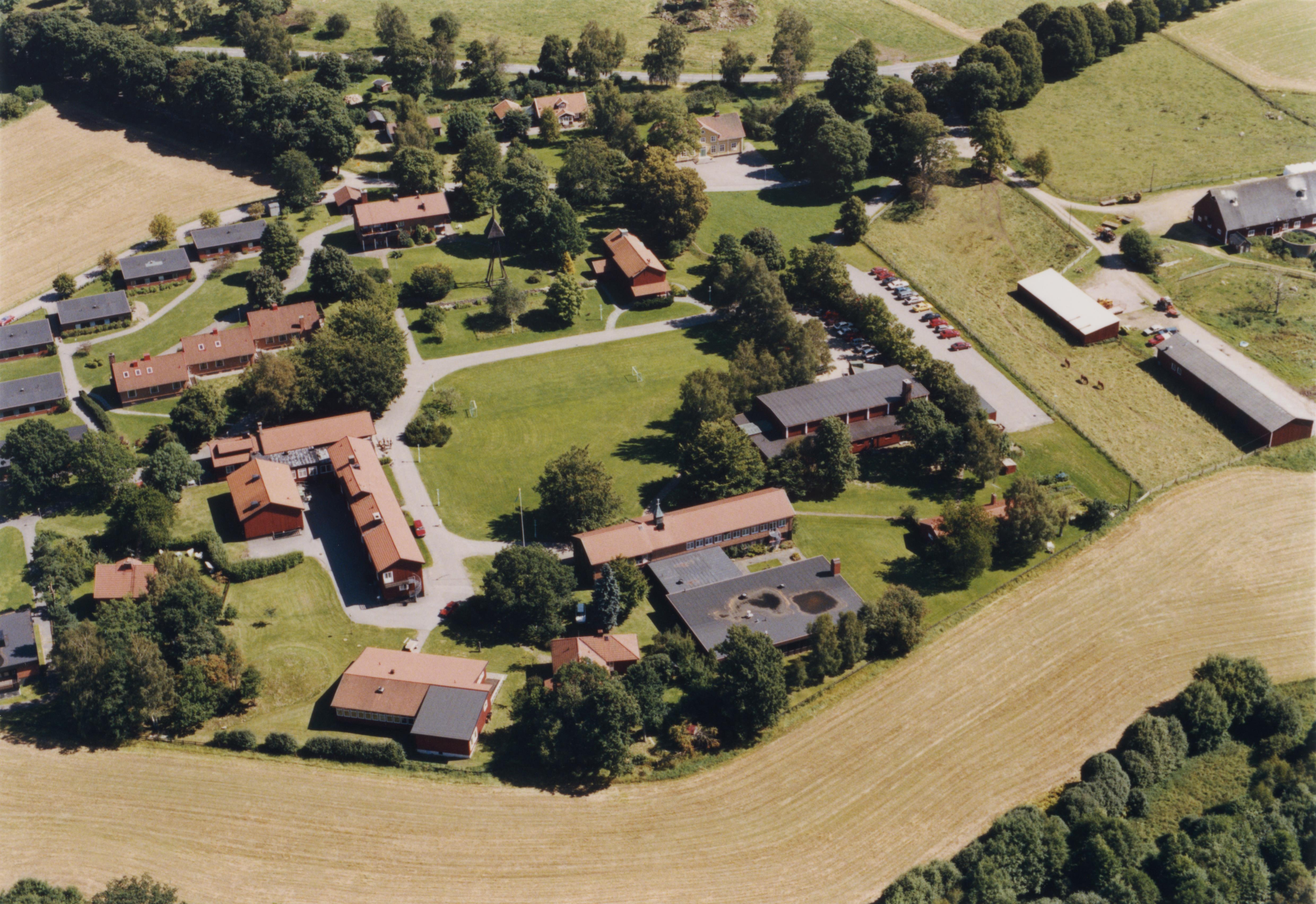 Beskrivning: Området Kronoberg norr om Växjö stad. Sankt Sigfrids folkhögskola med Sankt Sigfrids kapell vid Kalvsundet i Helgasjön. I bildens övre del gravfält RAÄnr Växjö 90:1. Bilden är tagen mot (väderstreck): Ö