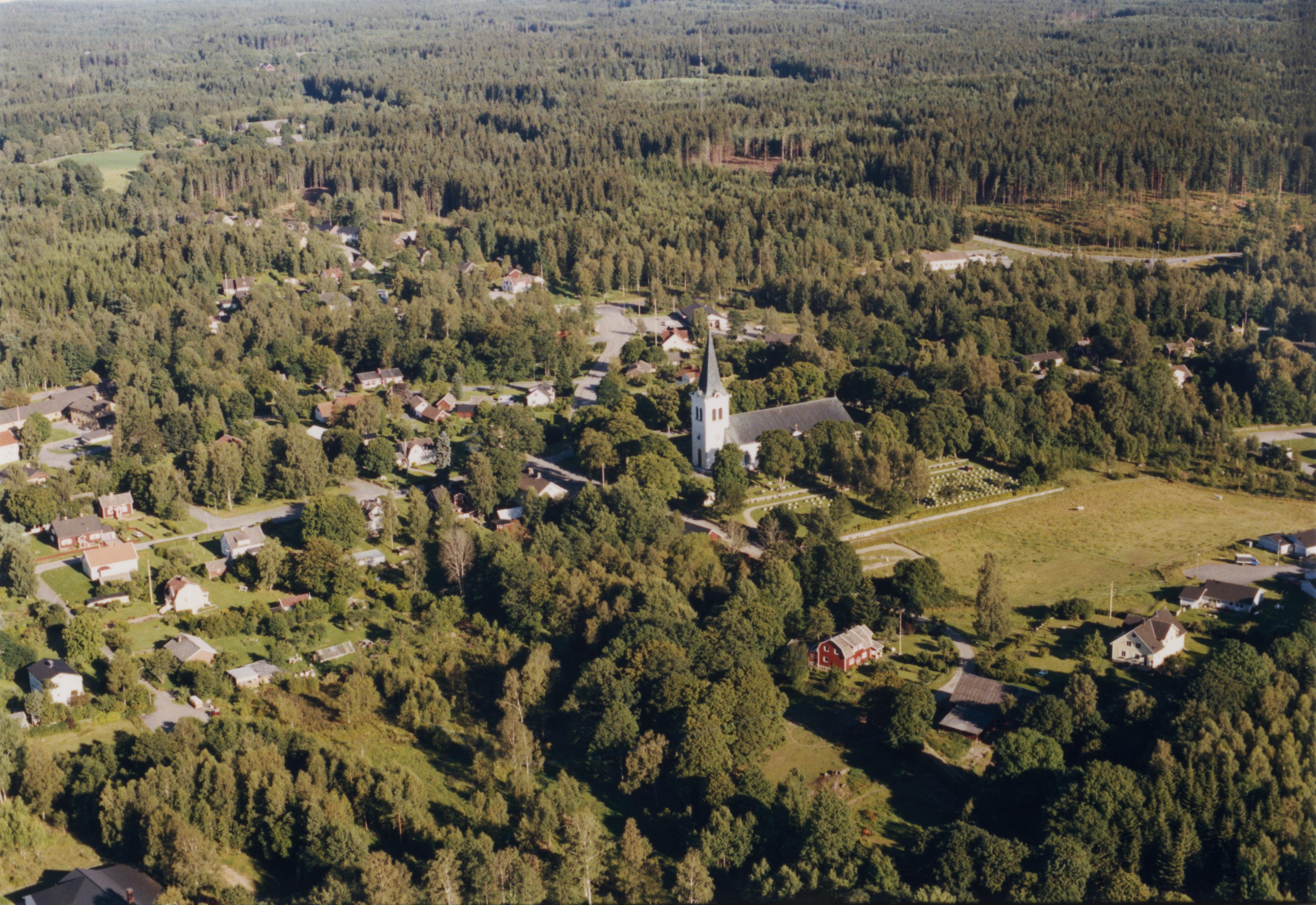 Beskrivning: Älmeboda kyrka i Rävemåla by. Till höger om kyrkan bytomt RAÄnr Älmeboda 143:1. Bilden är tagen mot (väderstreck): OSO