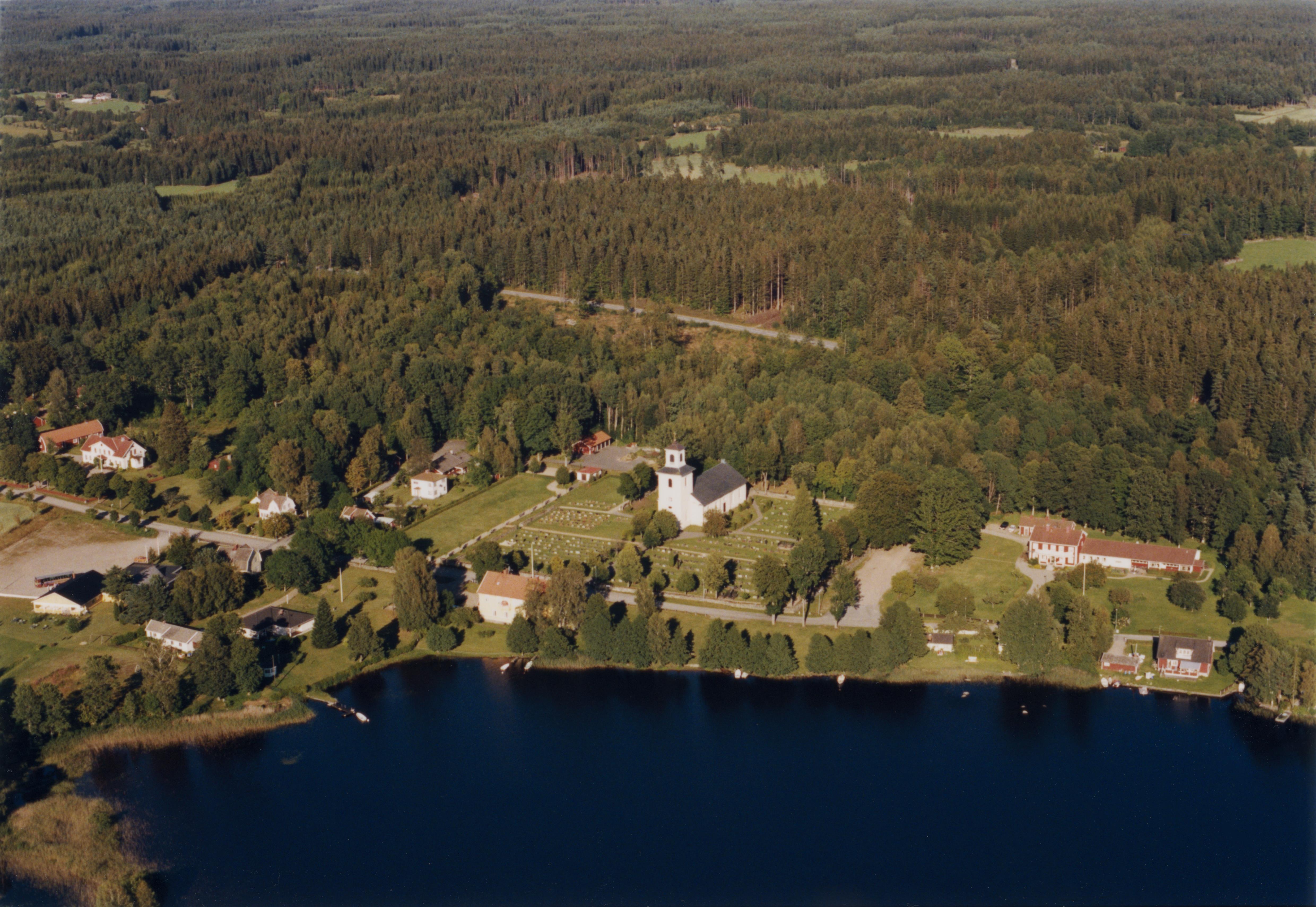 Beskrivning: Södra Sandsjö kyrka och kyrkby vid Sandsjön. Bilden är tagen mot (väderstreck): Ö