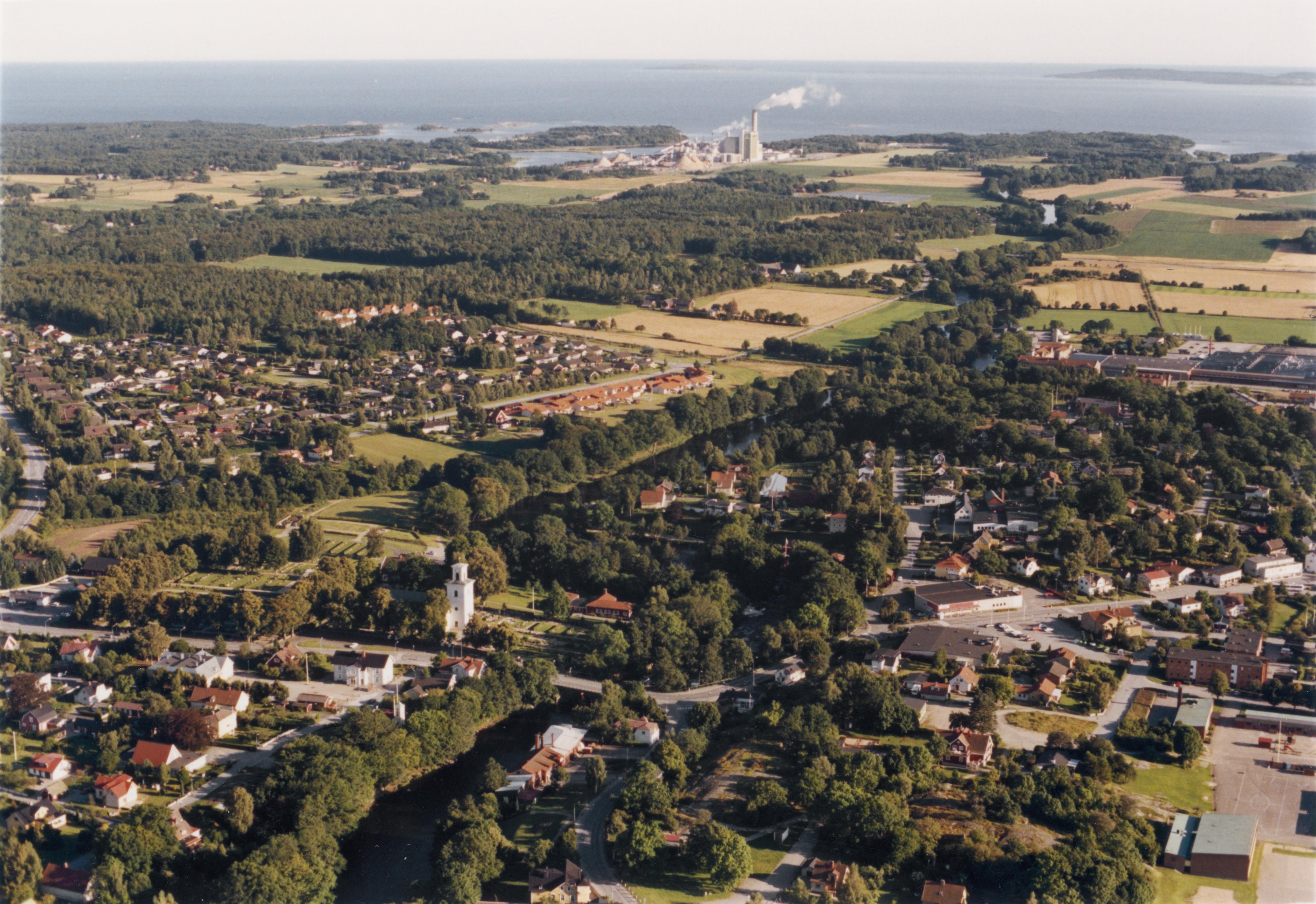 Beskrivning: Mörrums tätort. Mörrumsån mot Pukeviksbukten. Mörrums kyrka till vänster under bildens mitt. Mörrums bruk i bildens övre del. Socknet Elleholm uppe till höger. Bilden är tagen mot (väderstreck): SO