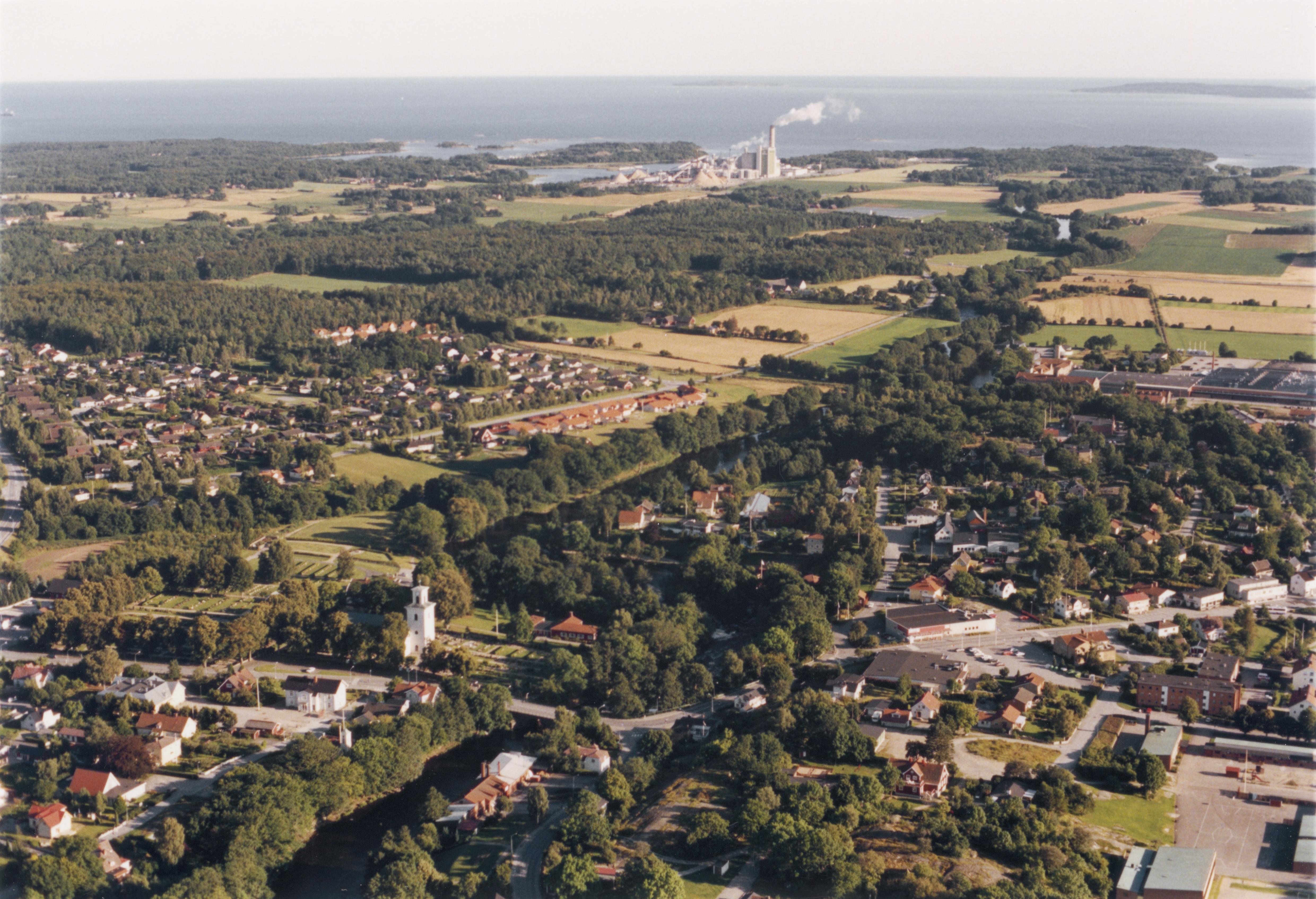 Beskrivning: Mörrums tätort. Mörrumsån mot Pukeviksbukten. Mörrums kyrka till vänster under bildens mitt. Mörrums bruk i bildens övre del. Socknet Elleholm uppe till höger. Bilden är tagen mot (väderstreck): SO