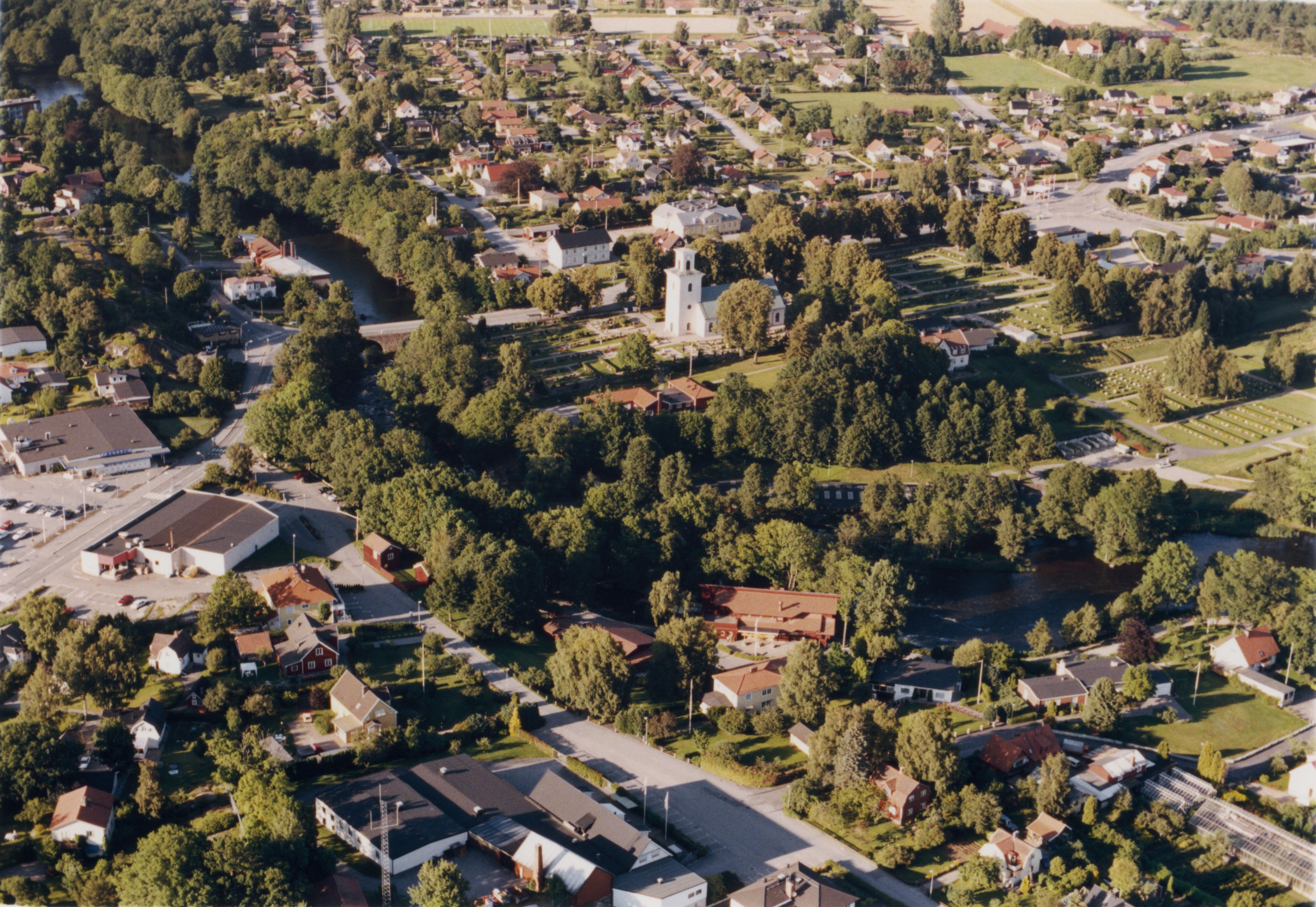 Beskrivning: Tätorten Mörrum vid Mörrumsån. Mörrums kyrka vid bildens mitt. Bilden är tagen mot (väderstreck): NO