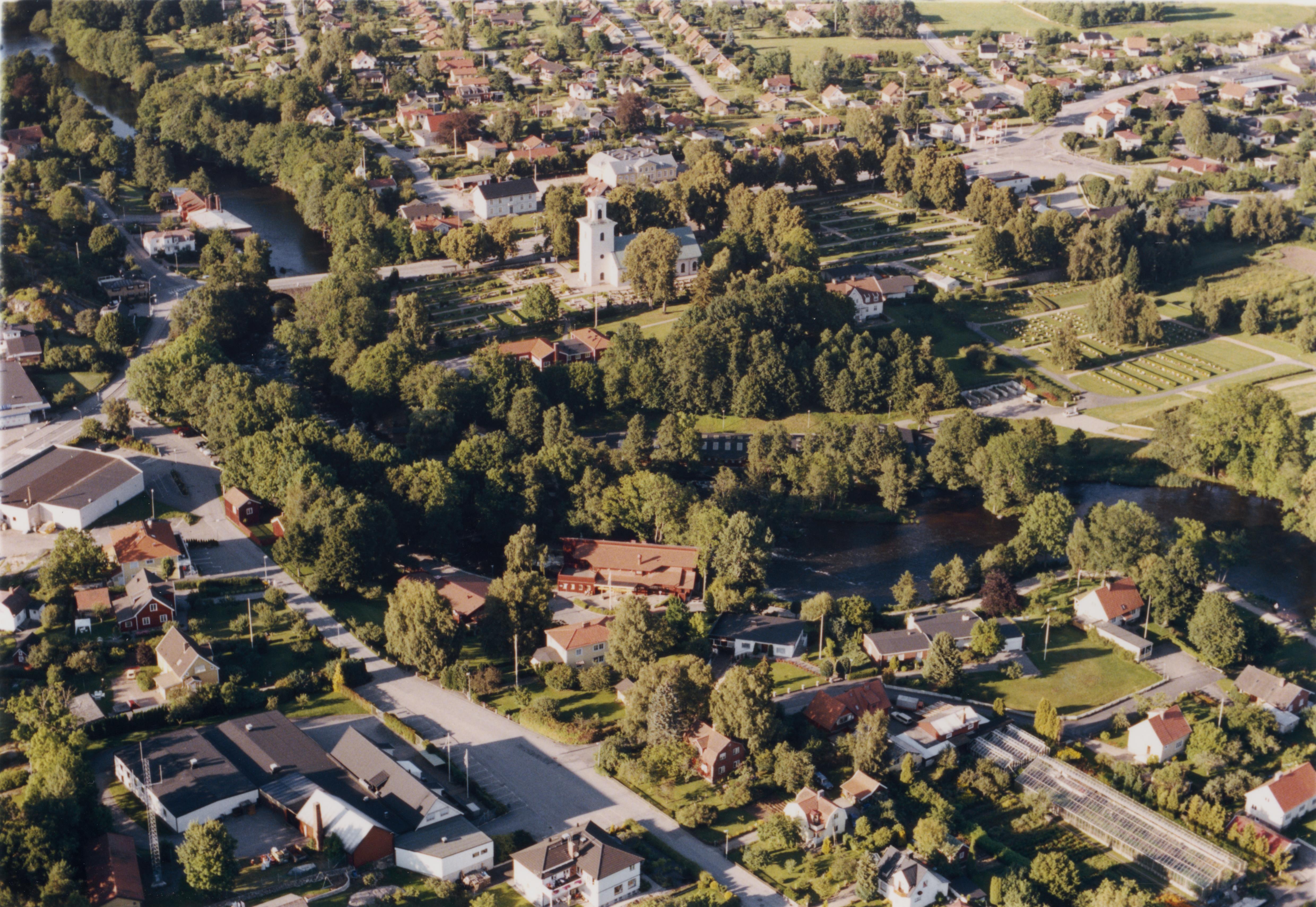 Beskrivning: Tätorten Mörrum vid Mörrumsån. Mörrums kyrka vid bildens mitt. Bilden är tagen mot (väderstreck): NO