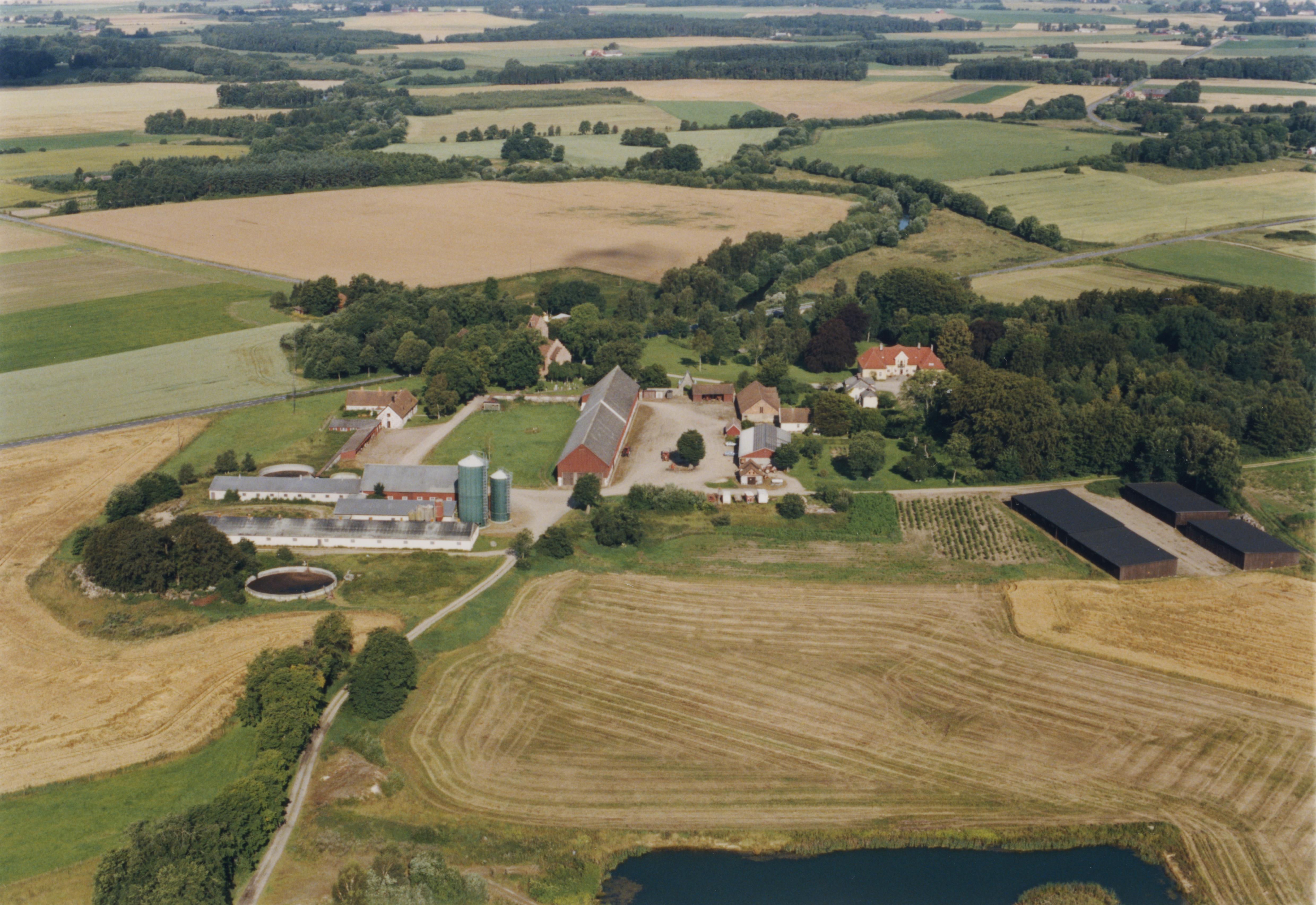 Beskrivning: Gumlösa kyrka och Sinclairsholms slott vid Almaån. Bilden är tagen mot (väderstreck): NV