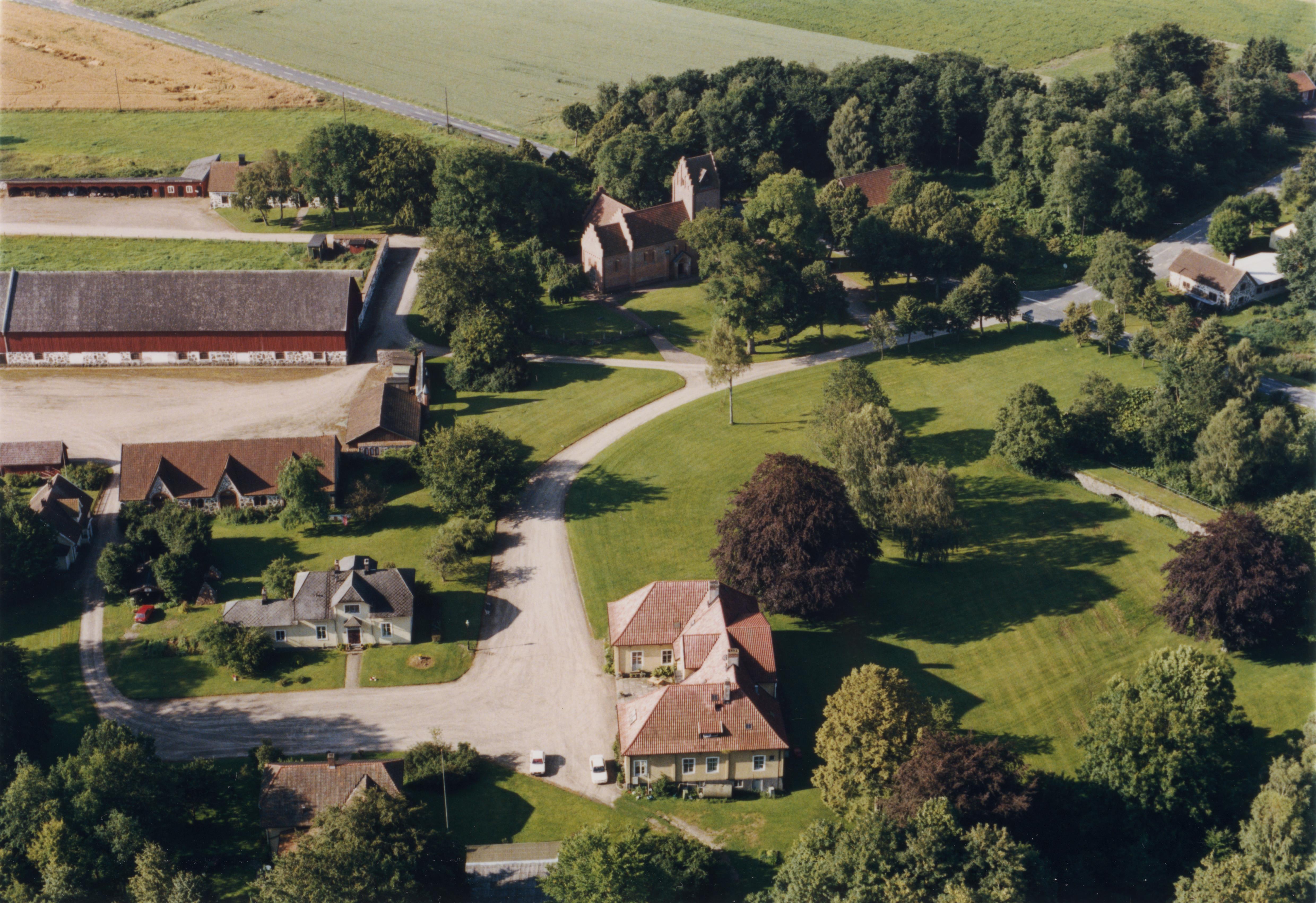 Beskrivning: Gumlösa kyrka och Sinclairsholms slott vid Almaån. Bilden är tagen mot (väderstreck): SV