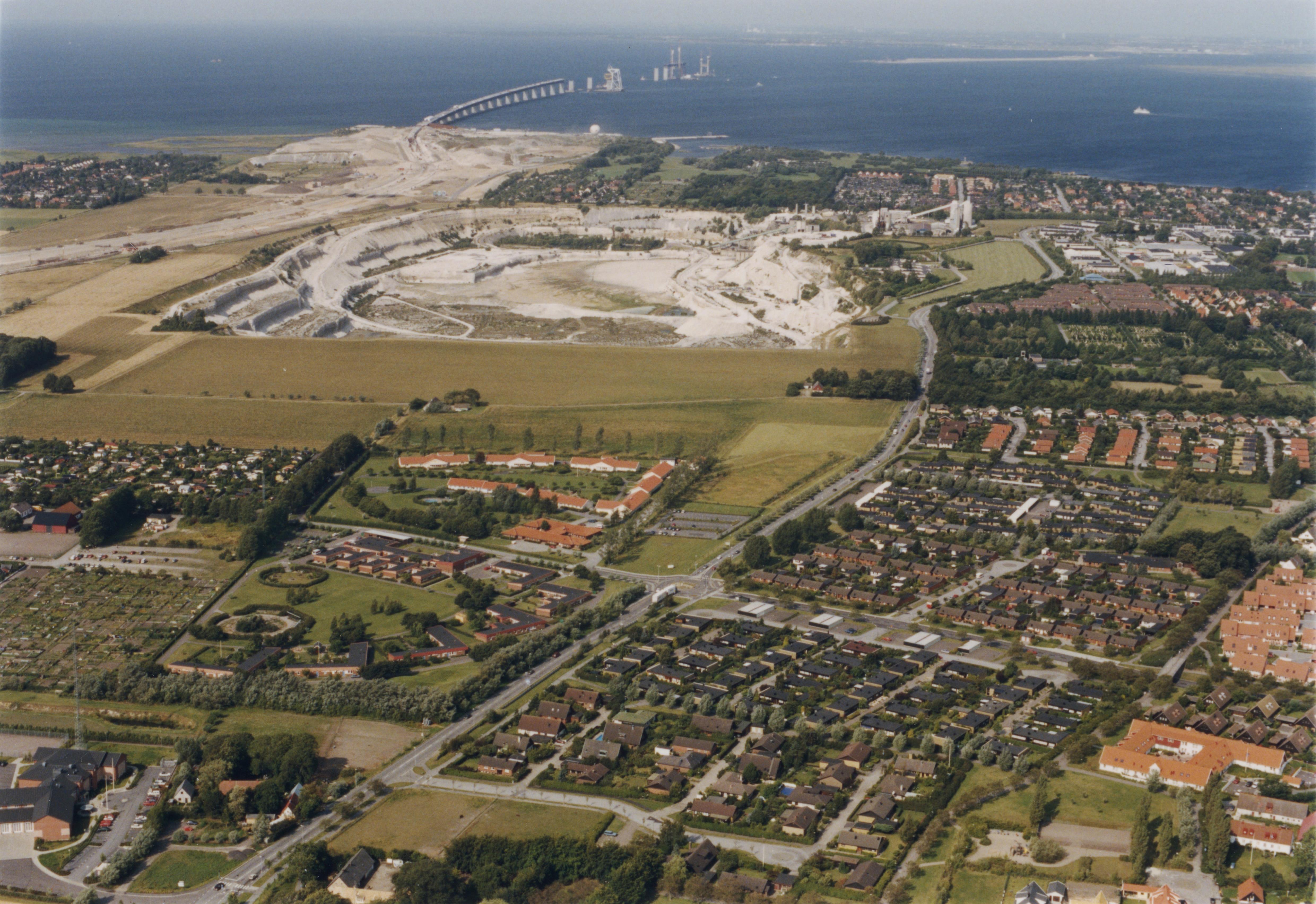 Beskrivning: Öresundsbron. Limhamns kalkbrott vid Sibbarp. Delar av Bunkeflostrand i Brunkeflo socken till vänster. Bilden är tagen mot (väderstreck): V