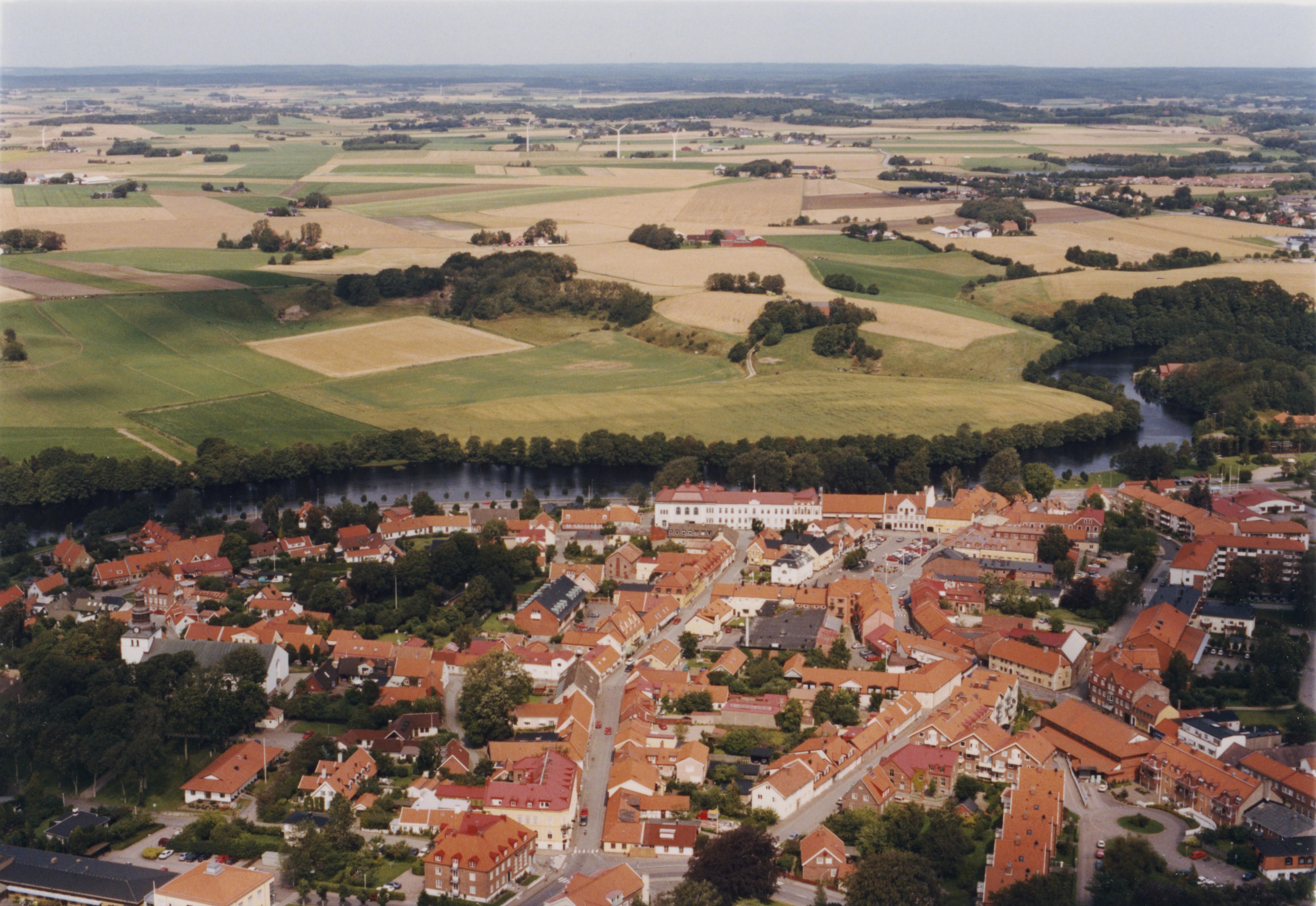 Beskrivning: Laholms stad vid ån Lagan. Laholms kyrka nere till vänster. Bilden är tagen mot (väderstreck): N