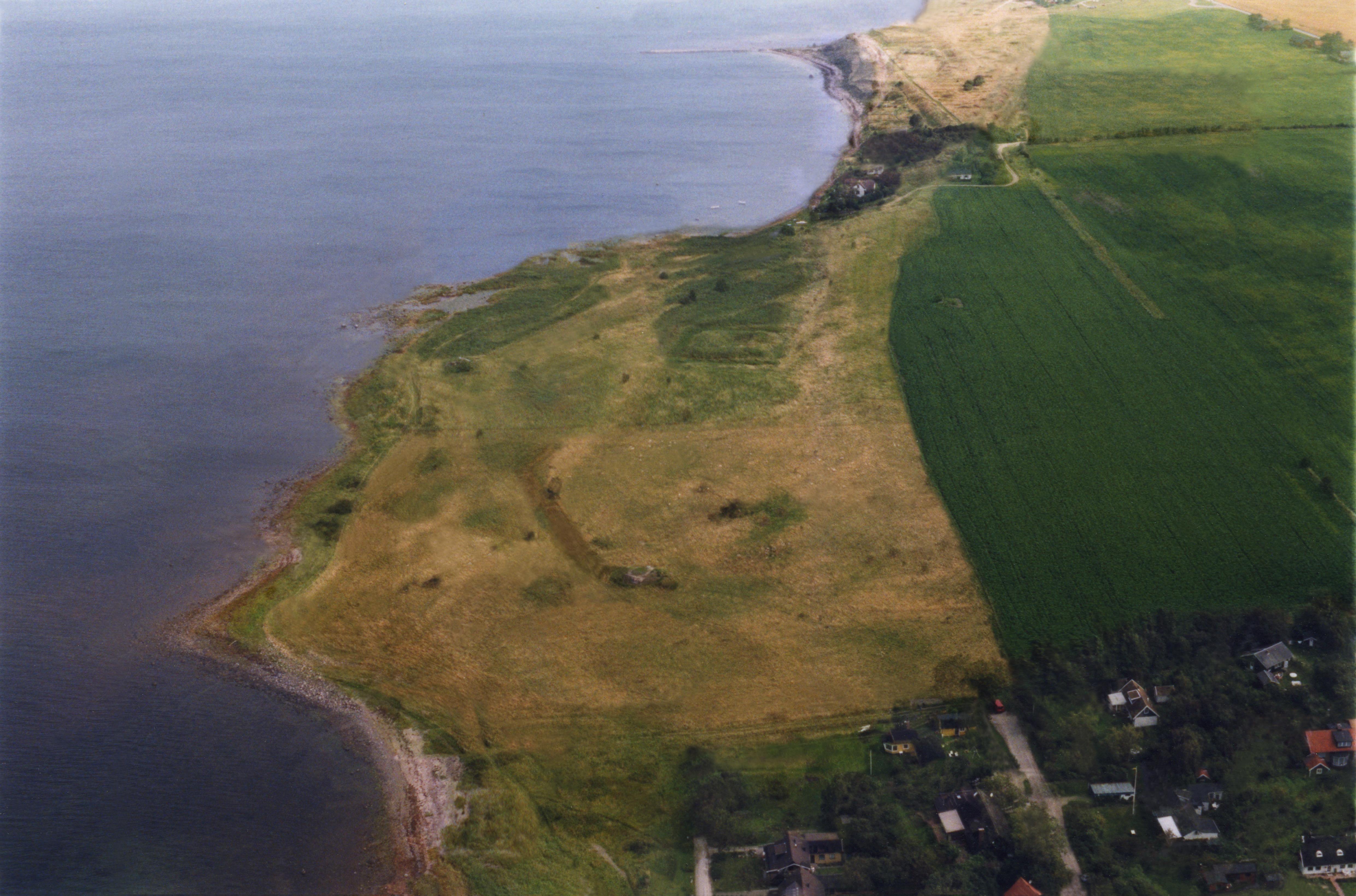 Beskrivning: Skans Stenbocksvallarna RAÄnr Barsebäck 106:1-107:1, boplats 96:1, hög 4:1 v. Tegelvik och Sjöbo, N om Barsebäckshamn. <NB! Bilden är skadat pga dubbelexponering och är rekonstruerat. Fel kan därför förekomma i motivet.> Bilden är tagen mot (väderstreck): N