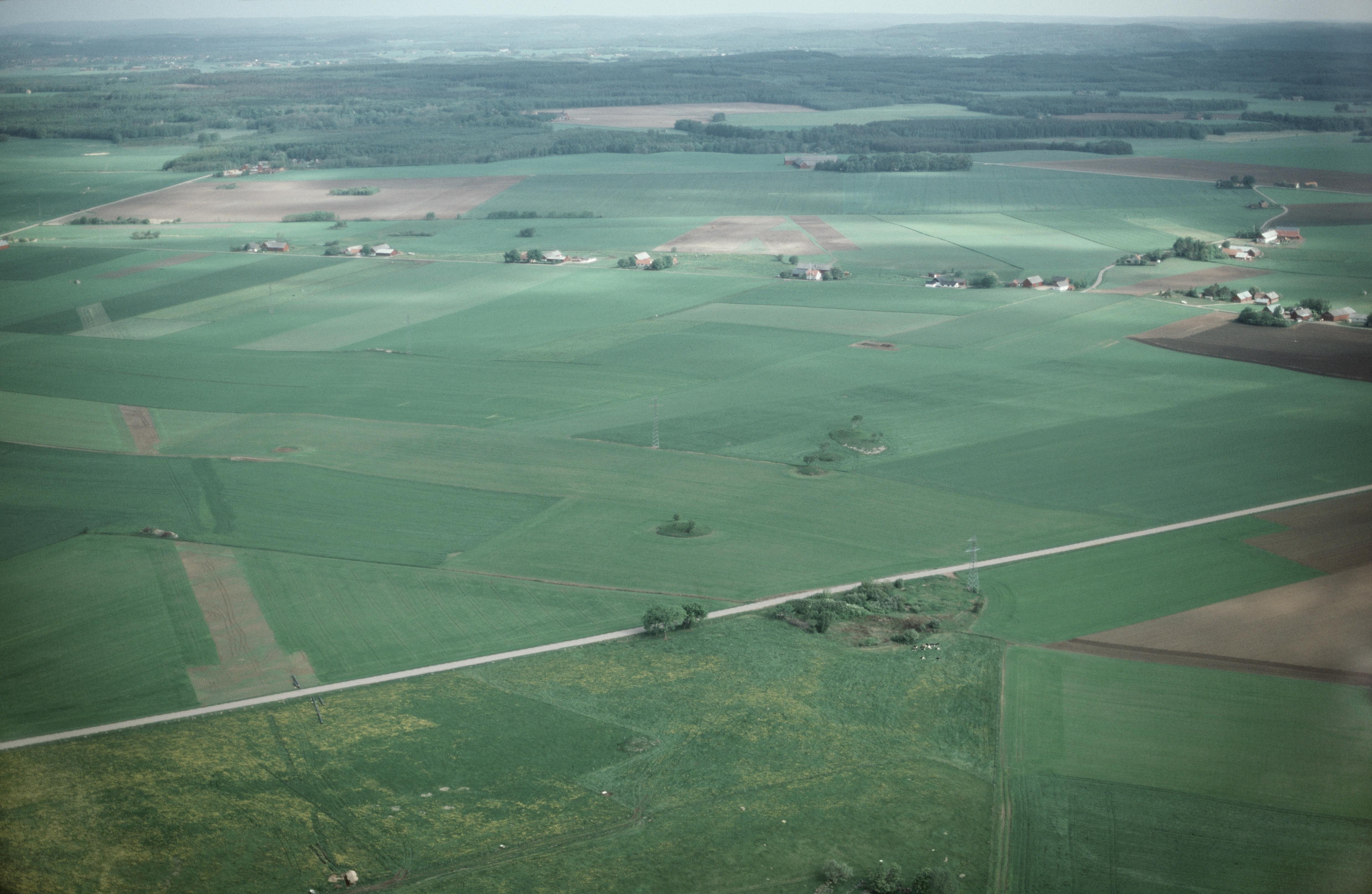Beskrivning: Område vid Klockargården nere till vänster och spår efter nergrävd gasledning. Vid bildens mitt hög RAÄnr Eldsberga 45:1-2 m.fl. Bilden är tagen mot (väderstreck): NV