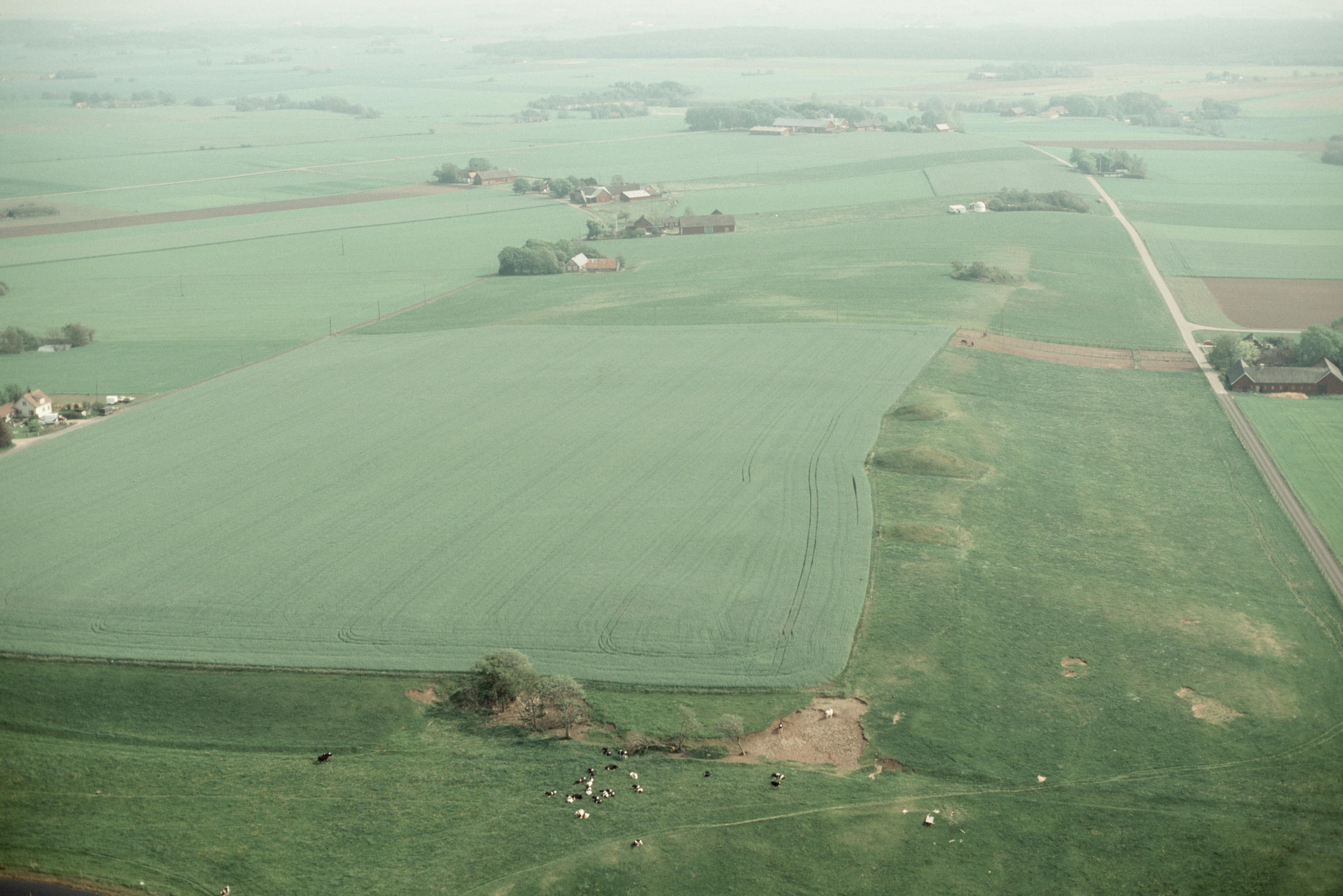 Beskrivning: Truedsgården. Gravhögar RAÄnr Eldsberga 2:1, 3:1, 4:1 m.fl. till höger om bildens mitt. Bilden är tagen mot (väderstreck): S