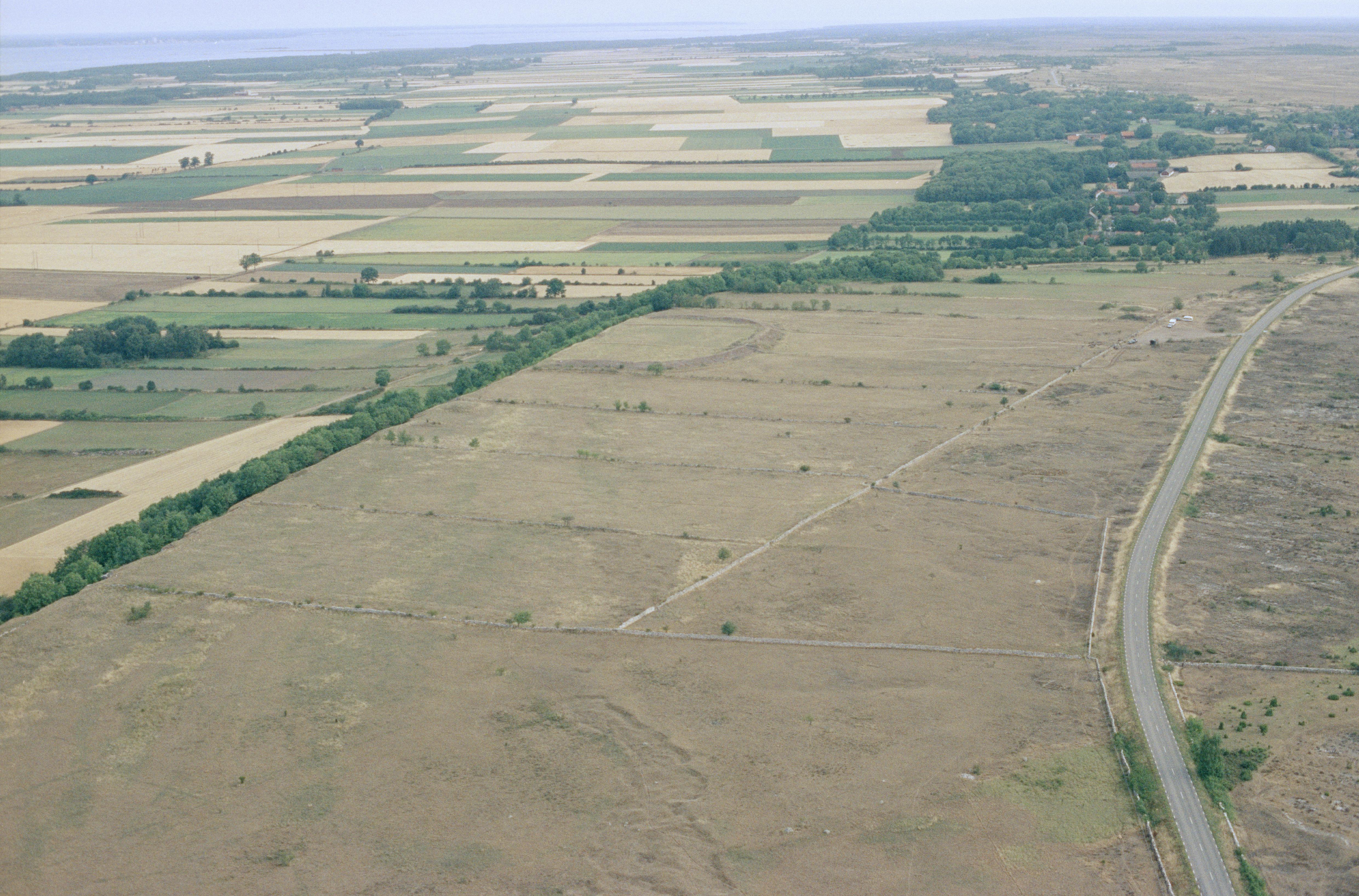 Beskrivning: Alvaret. Fornborg Bårbyborg / Bårby borg RAÄnr Mörbylånga 17:1 vid bildens mitt. I bildens övre del Södra Bårby. Bilden är tagen mot (väderstreck): NNO