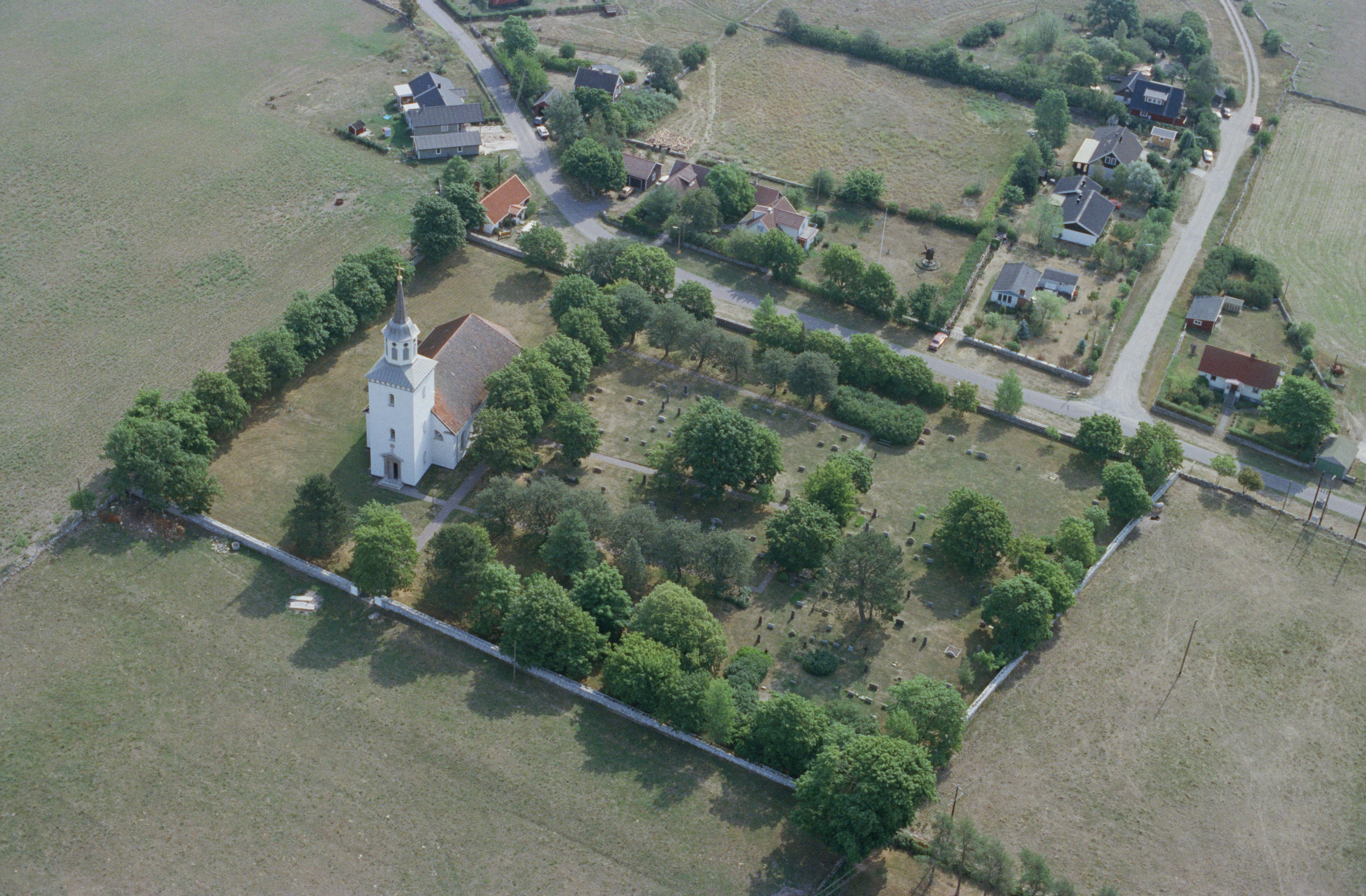 Beskrivning: Alvaret. Sandby kyrka och kyrkby. Bilden är tagen mot (väderstreck): ONO