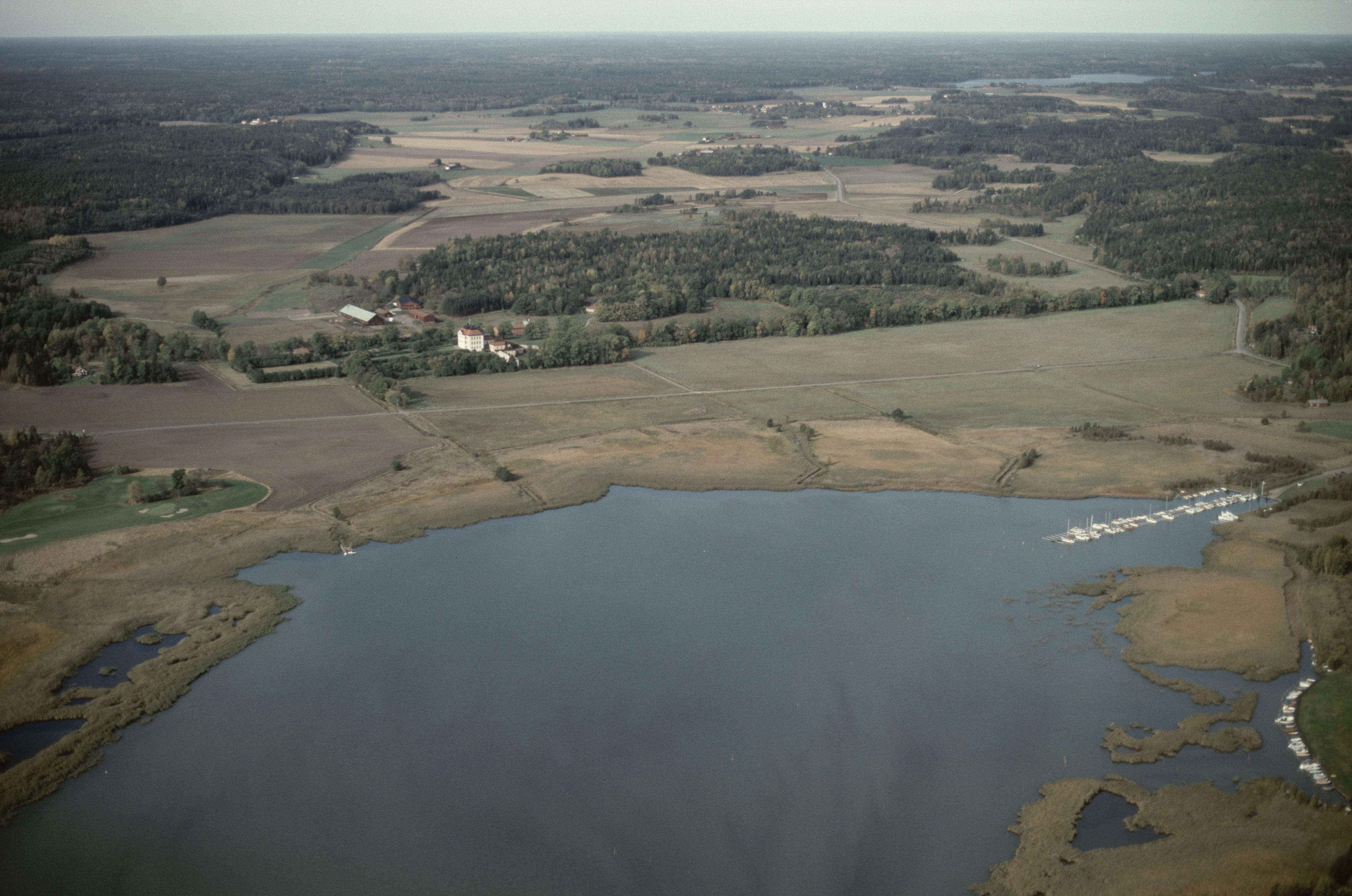 Beskrivning: Tureholmsviken. Över bildens mitt byggnadsminnet / slottet Tureholm (skrivs även Thureholm). Bilden är tagen mot (väderstreck): NV