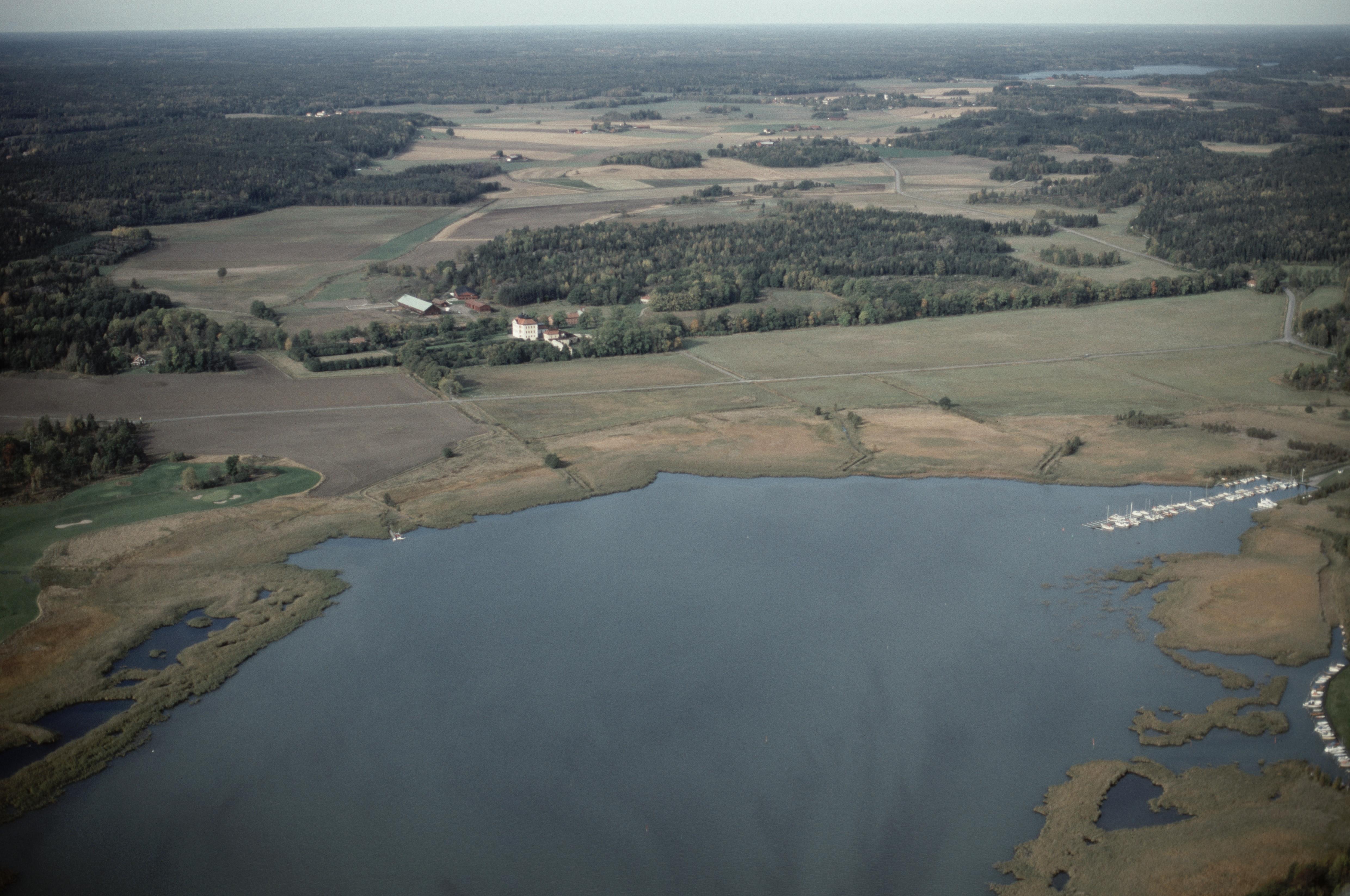 Beskrivning: Tureholmsviken. Över bildens mitt byggnadsminnet / slottet Tureholm (skrivs även Thureholm). Bilden är tagen mot (väderstreck): NV