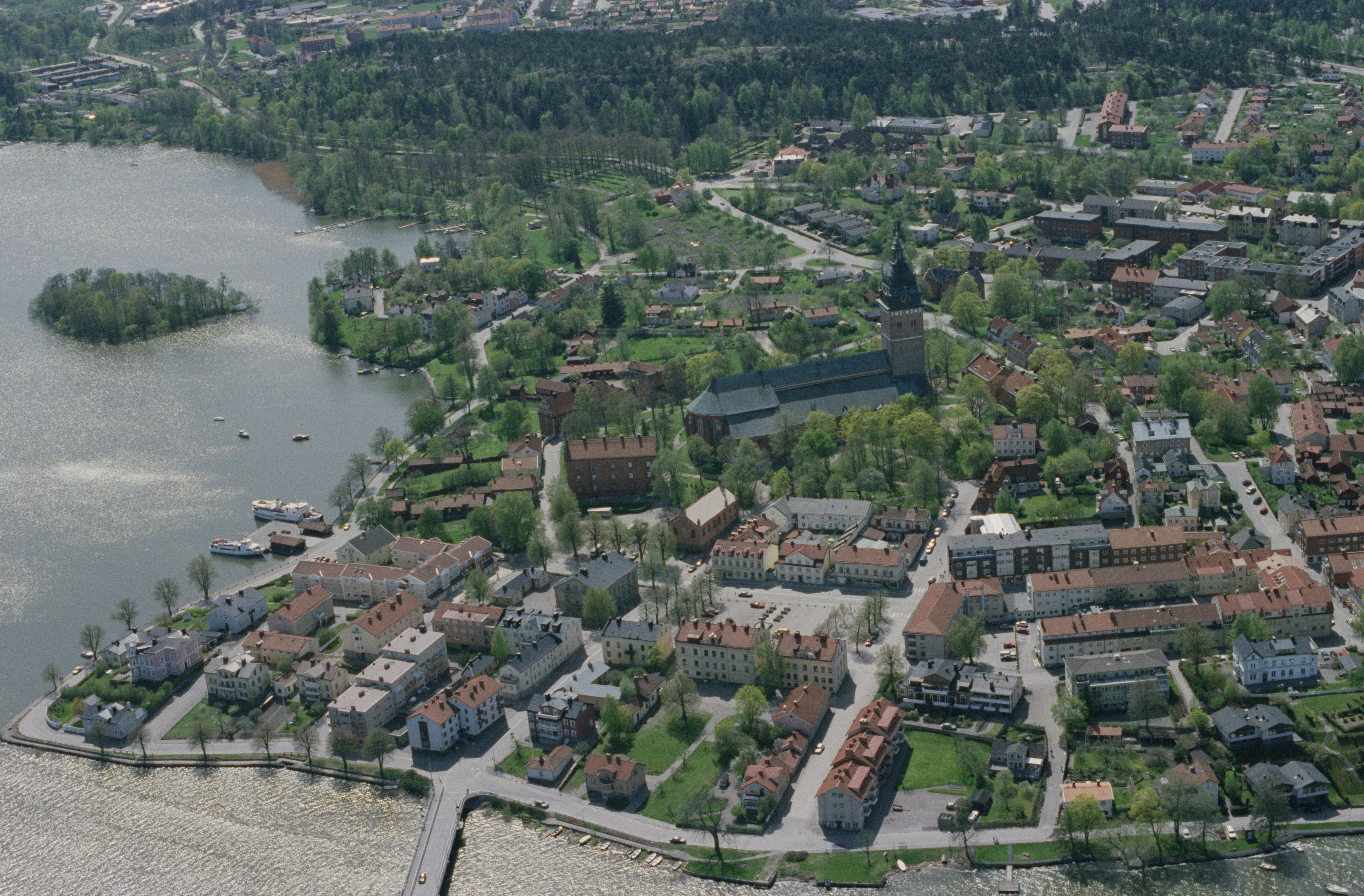 Beskrivning: Strängnäs stad. Strängnäs domkyrka vid bildens mitt. Bilden är tagen mot (väderstreck): SSV