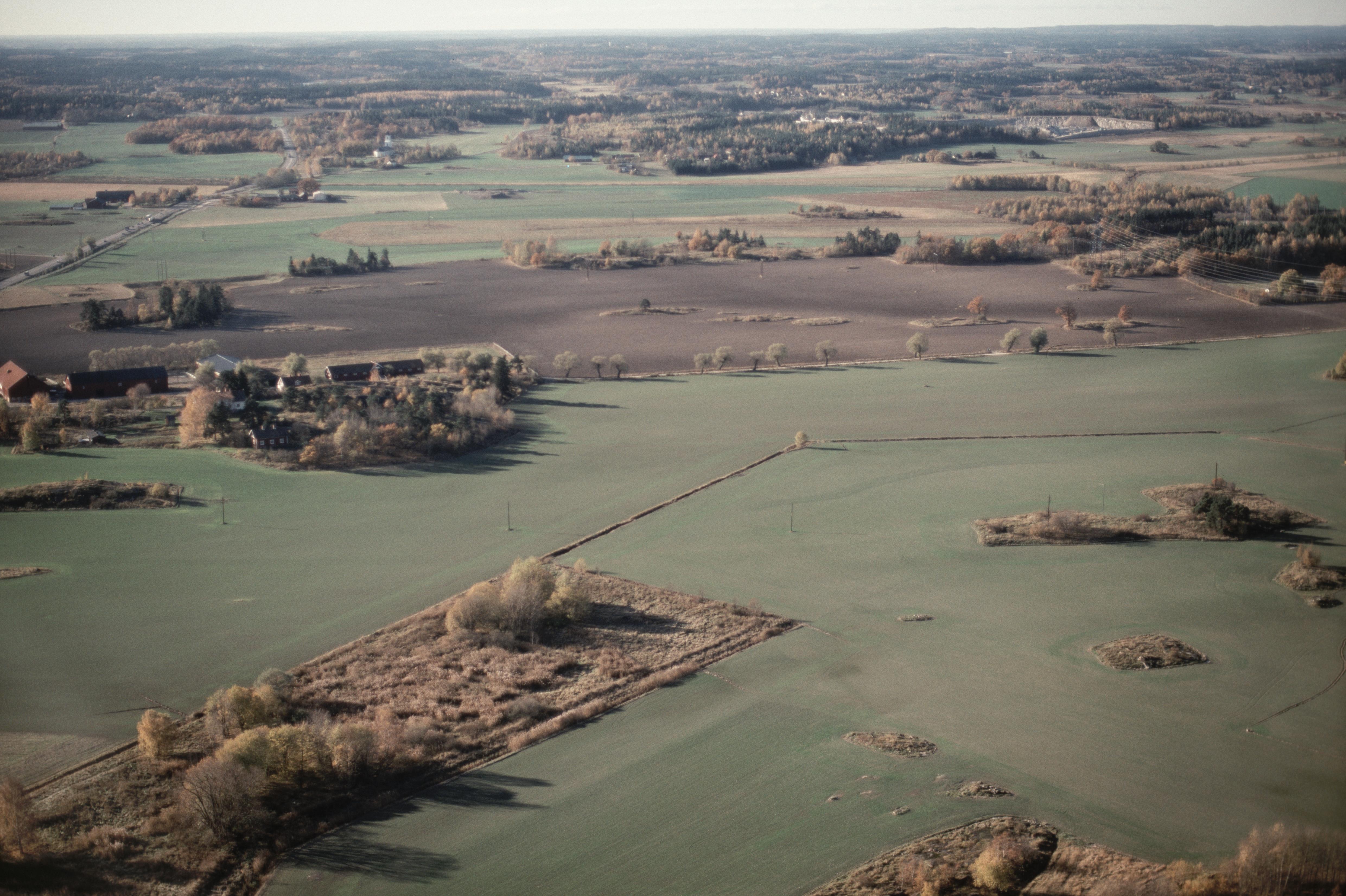 Beskrivning: Vid bildens mitt hällristningsområde RAÄnr Borg 23:1, 24:1, 25:1, 26:1-2, 27:1. vid Skälvs gård (i tid.i Borgs sn). Borgs kyrka i Herrebro till vänster i bildens övre del. Bilden är tagen mot (väderstreck): VSV
