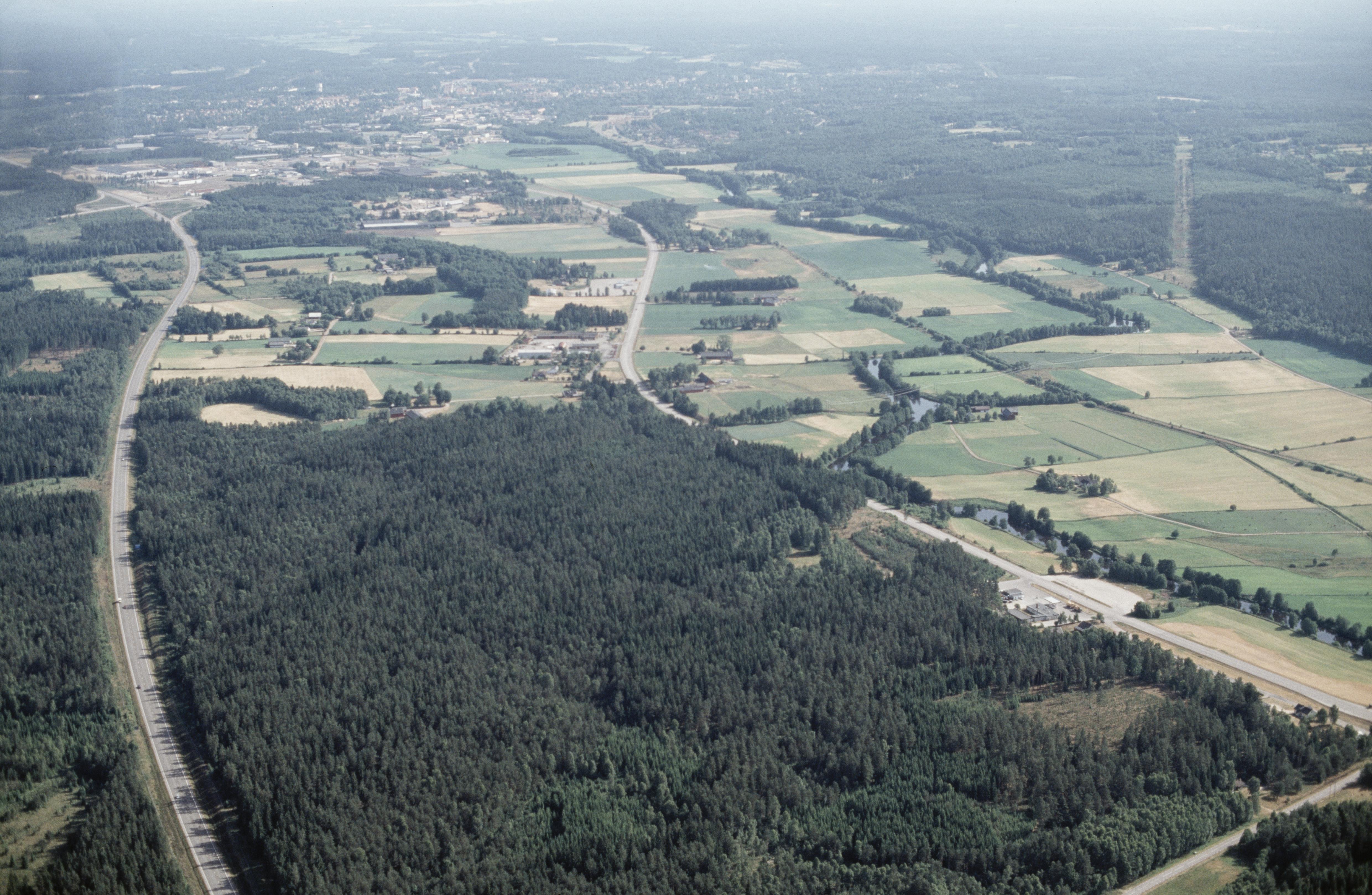 Beskrivning: Gravfält Kånna högar med runristning och hällristning RAÄnr Kånna 24:1-3. Kånna tätort med Kånna kyrka i bildens övre del. Bilden är tagen mot (väderstreck): NNO