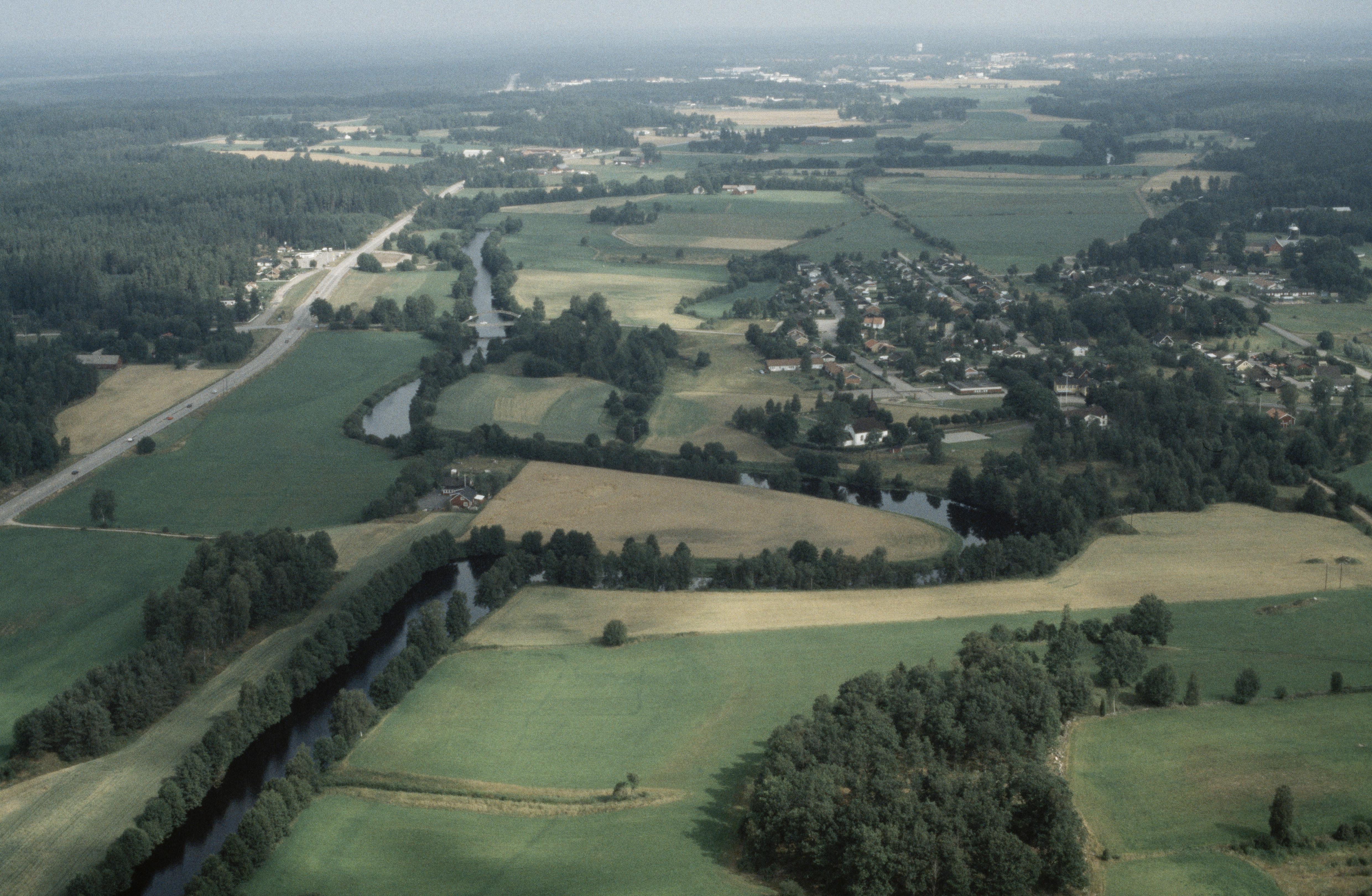 Beskrivning: Ån Lagan vid Kånna tätort. Kånna kyrka vid bildens mitt. Bilden är tagen mot (väderstreck): N