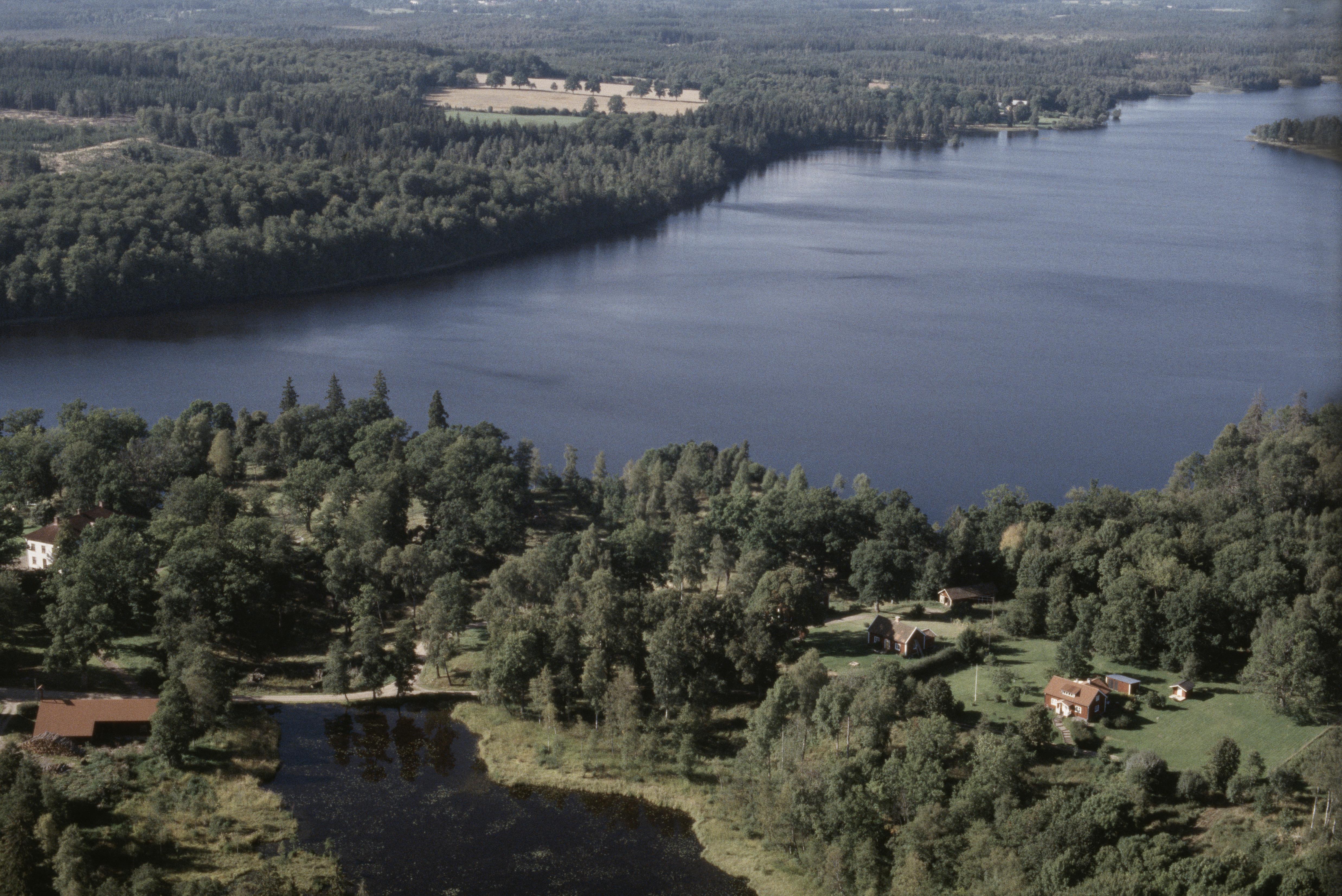 Beskrivning: Åminne herrgård (till vänster) och Åminne järnbruk RAÄnr Kärda 119:1 vid Källundasjön. Bilden är tagen mot (väderstreck): NV