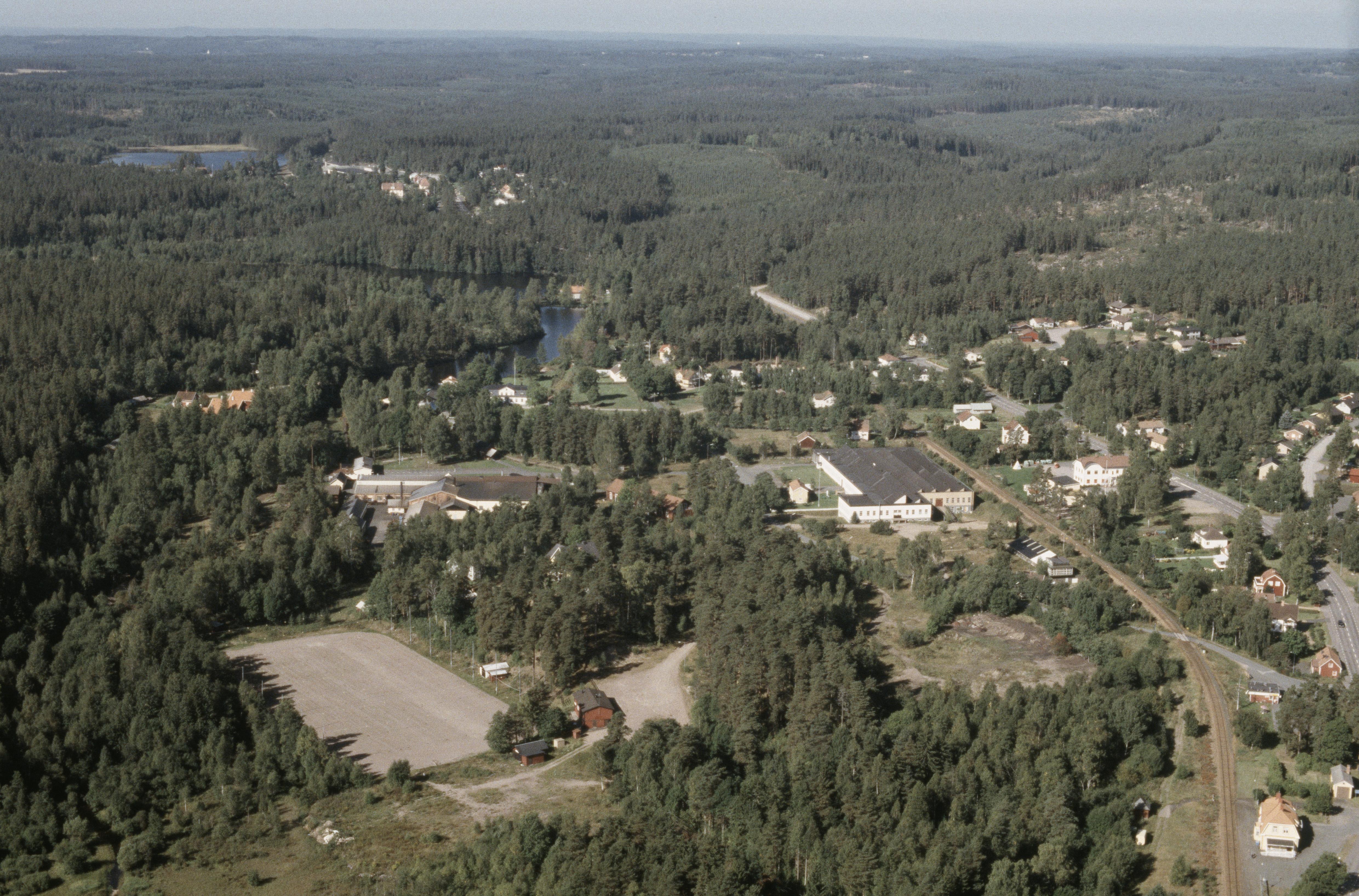 Beskrivning: Bruzaholms bruk. Bruzaholms herrgård till vänster vid bildens mitt. Järnbanespåret genom Bruzaholm. Stuveryd i bildens övre del. Bilden är tagen mot (väderstreck): SV