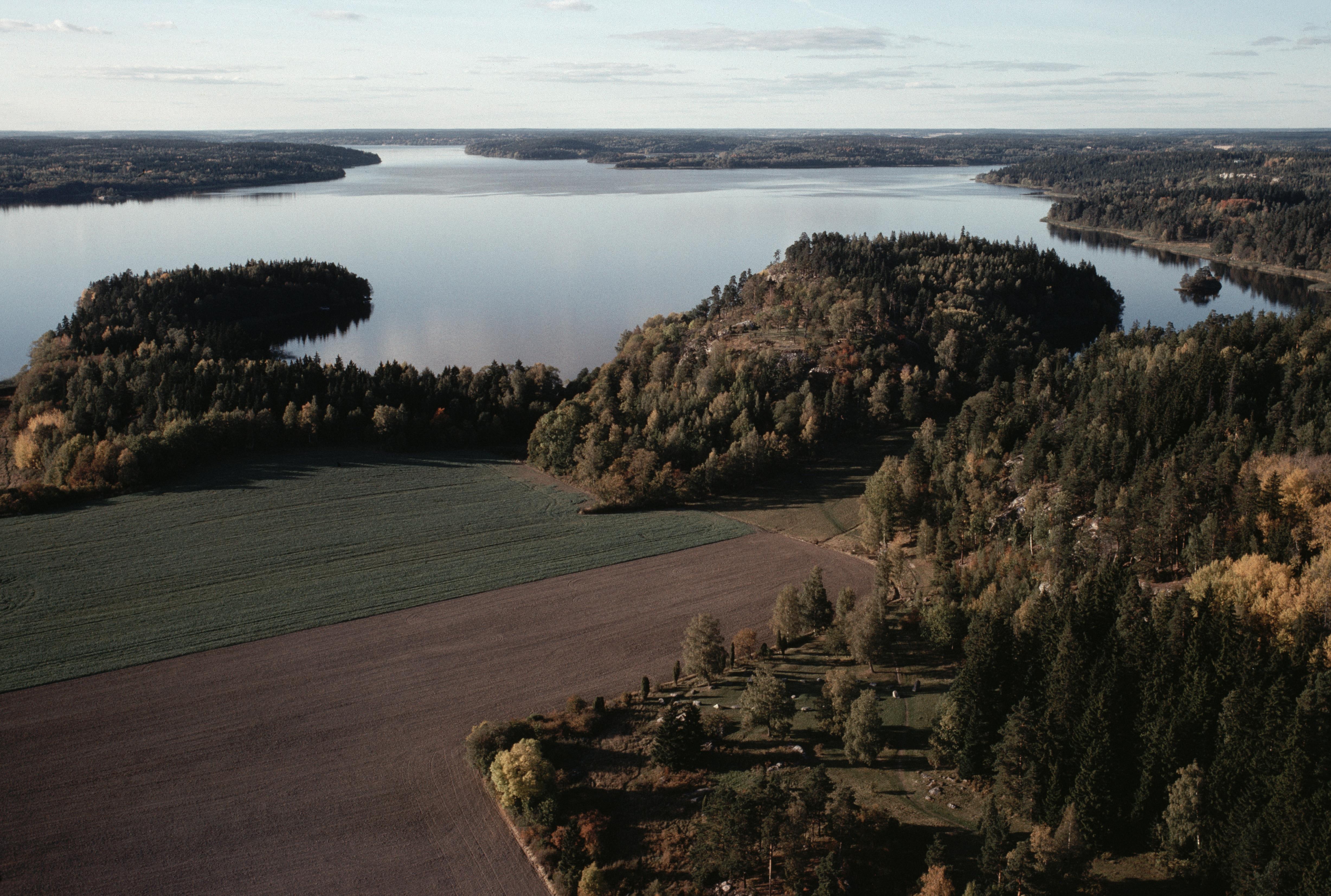 Beskrivning: Runsa gravfält med skeppssättning RAÄnr Ed 1:1 i bildens nedre del. Uppe till höger Runsa fornborg / ?Runsa borg? RAÄnr Ed 2:1. Norrsunda socken i bildens övre del. Bilden är tagen mot (väderstreck): NV