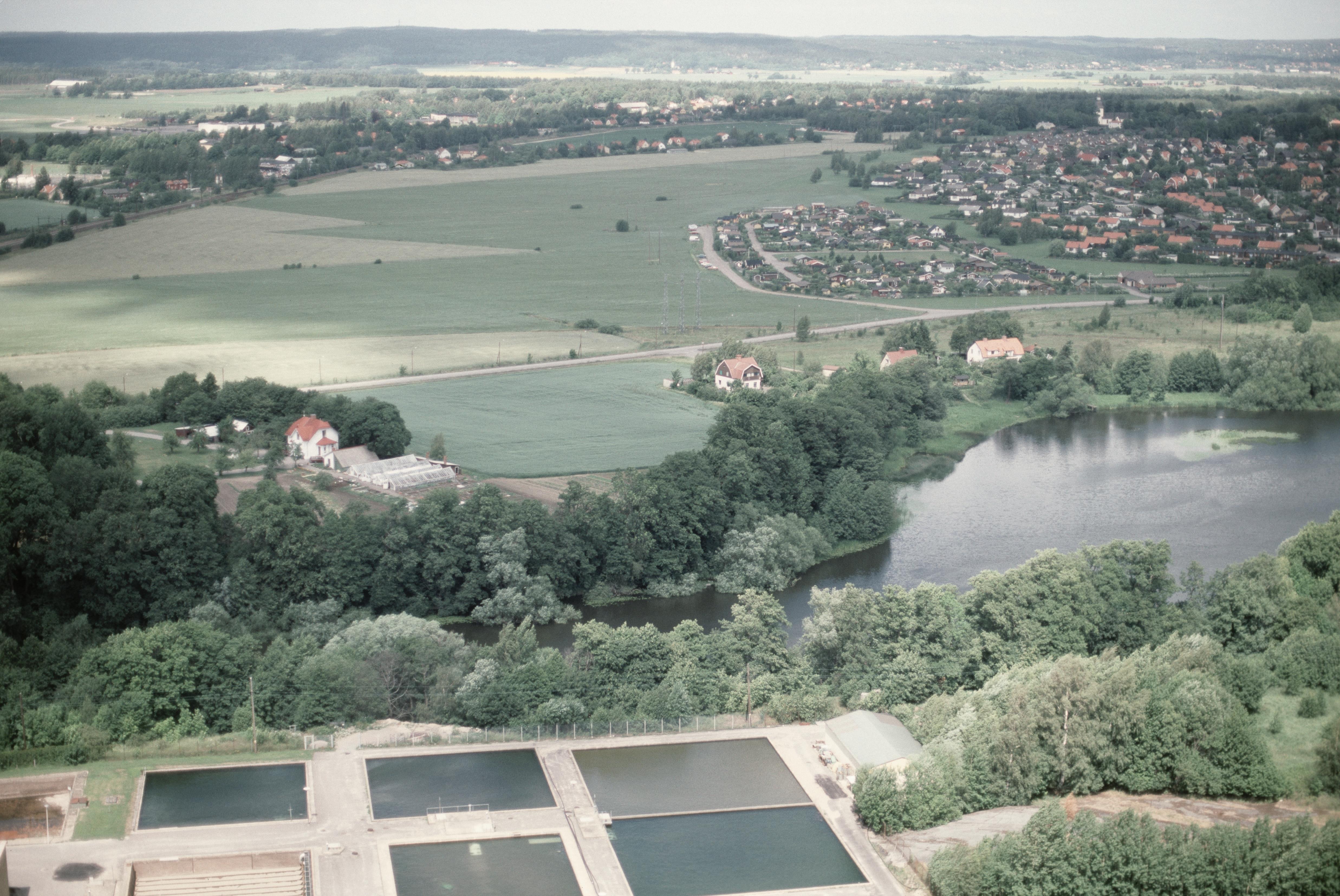 Beskrivning: Vattenverk vid Motala ström (mellan tid. socknar Borg och Östra Eneby) vid Fiskeby. I bildens övre del t.h. stadsdel Pryssgården och Östra Eneby kyrka i Norrköpings stad. Bilden är tagen mot (väderstreck): NO