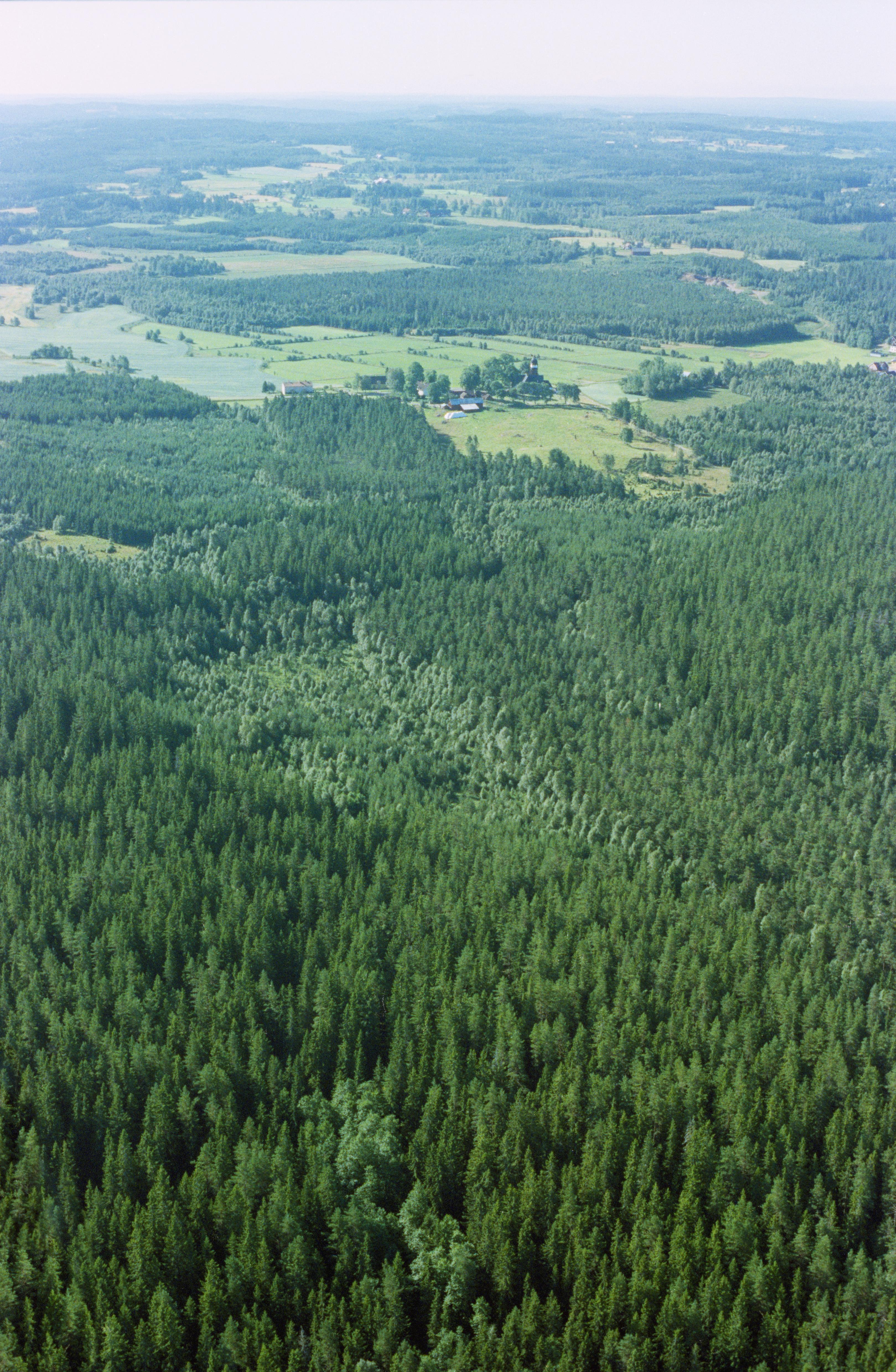 Beskrivning: Fossil åker RAÄnr Askeryd 419 vid bildens mitt. Askeryds kyrka och kyrkby i bildens övre del. Bilden är tagen mot (väderstreck): S