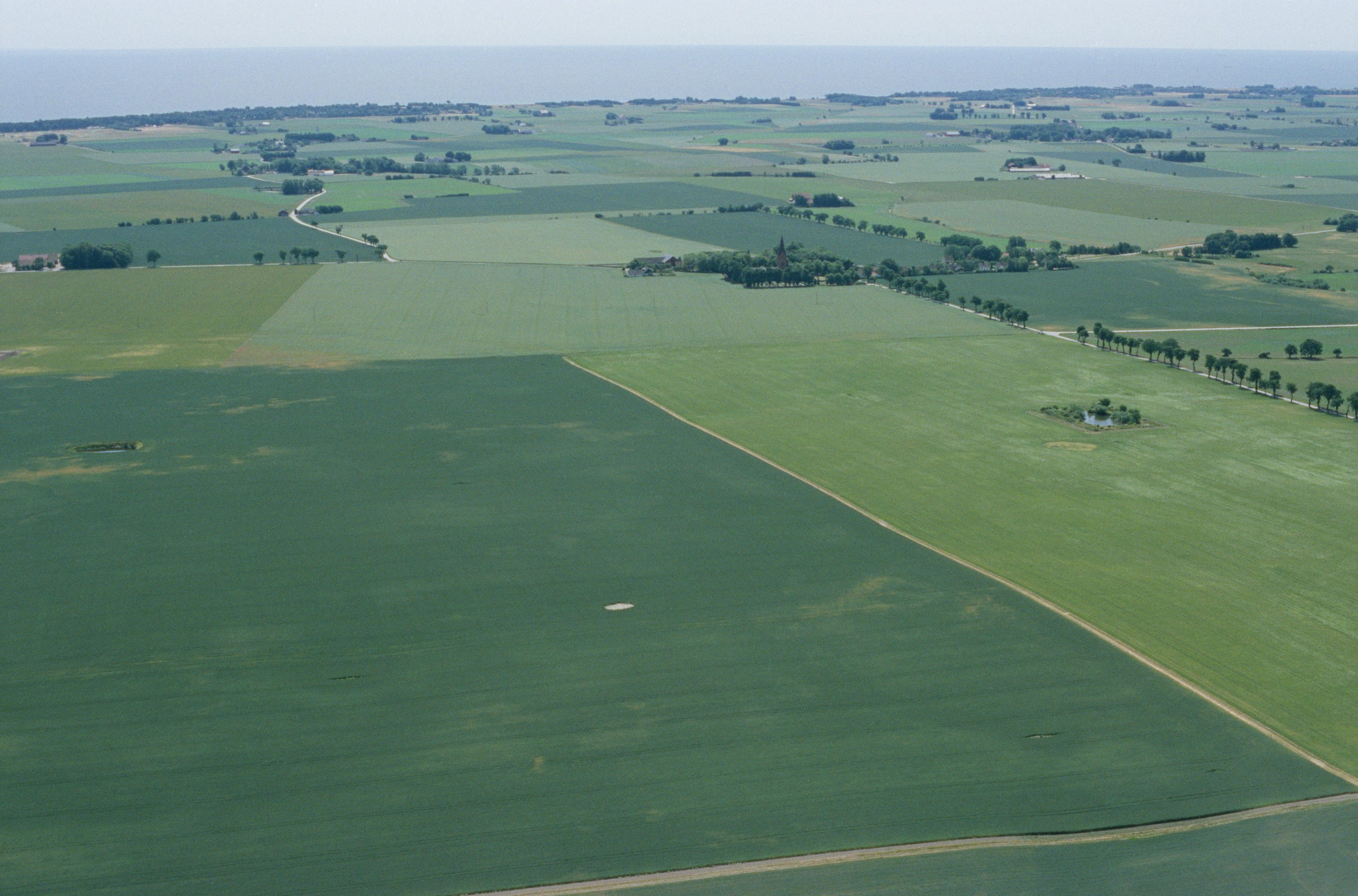 Beskrivning: Källstorps kyrka och kyrkby uppe till höger om bildens mitt. Bilden är tagen mot (väderstreck): SV