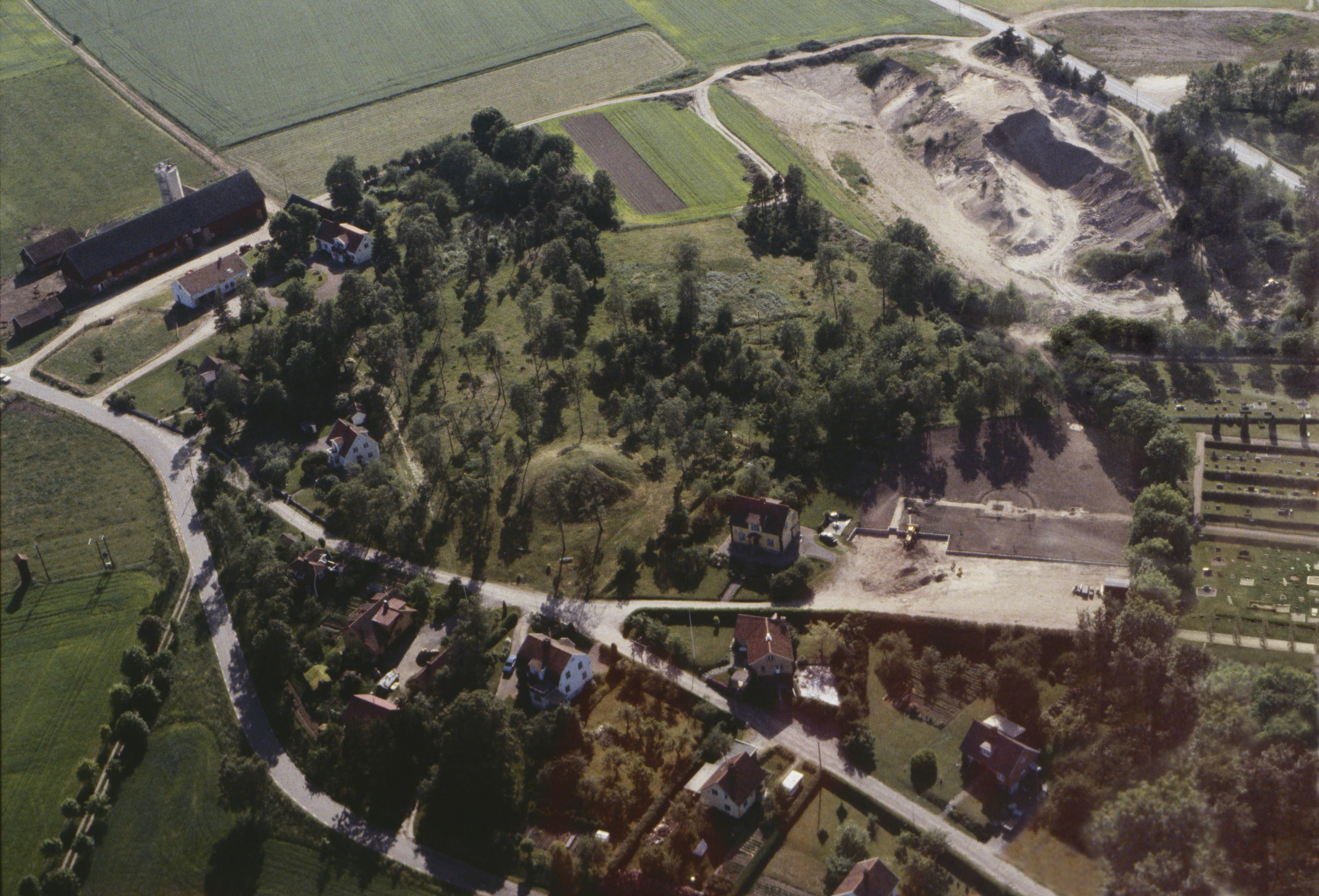 Beskrivning: Områden vid Larvs kyrka (kyrkogården i bildens högra kant). Vid bildens mitt gravfält och hög Larva bäsing RAÄnr Larv 22:1. Bilden är tagen mot (väderstreck): VSV