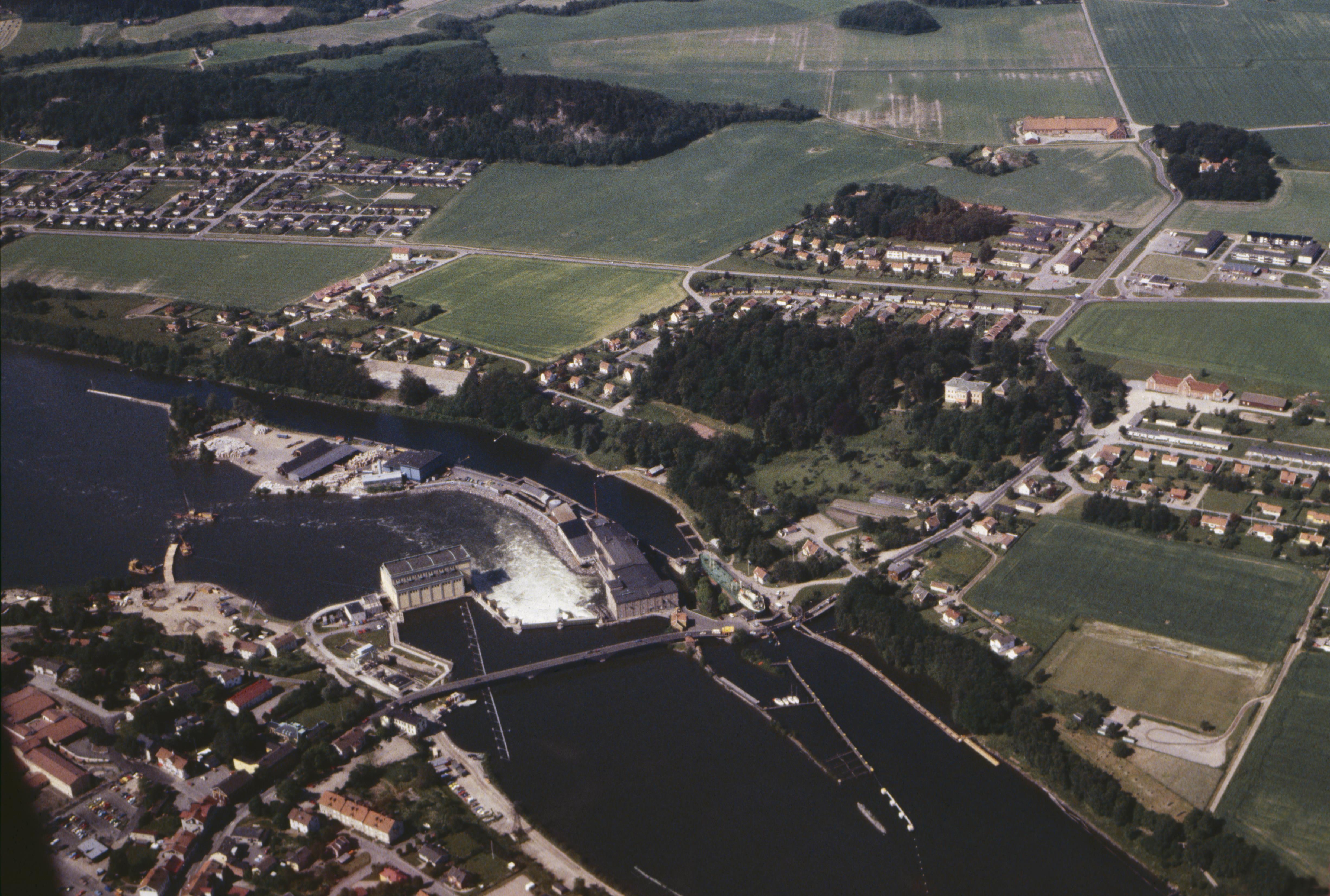 Beskrivning: Lilla Edets kraftverk i Göta älv. Sockengränsen mellan Fuxerna och Hjärtrum (till höger) går i älven. Bilden är tagen mot (väderstreck): S
