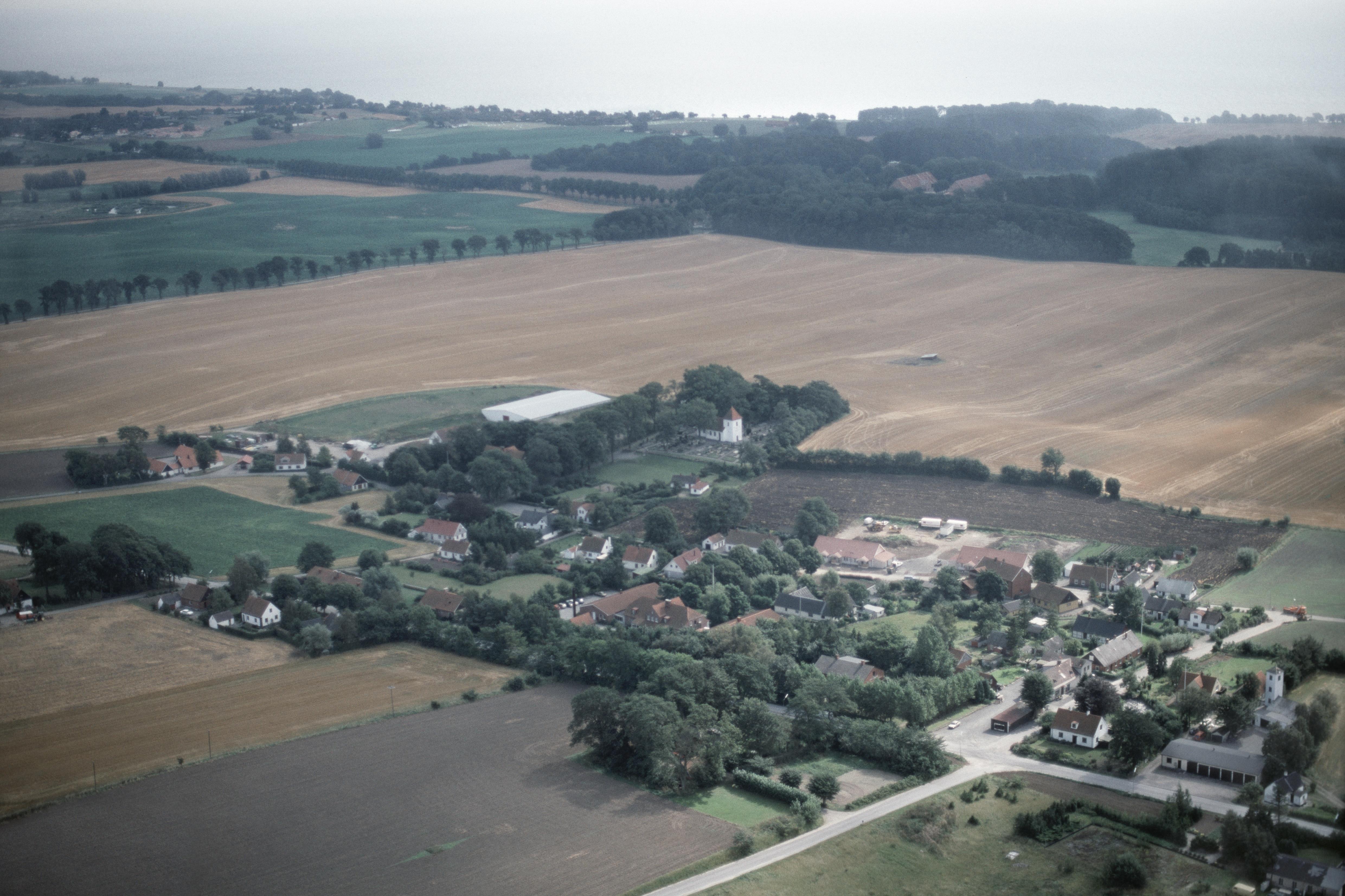 Beskrivning: Snårestads kyrka och kyrkby. Bilden är tagen mot (väderstreck): SO