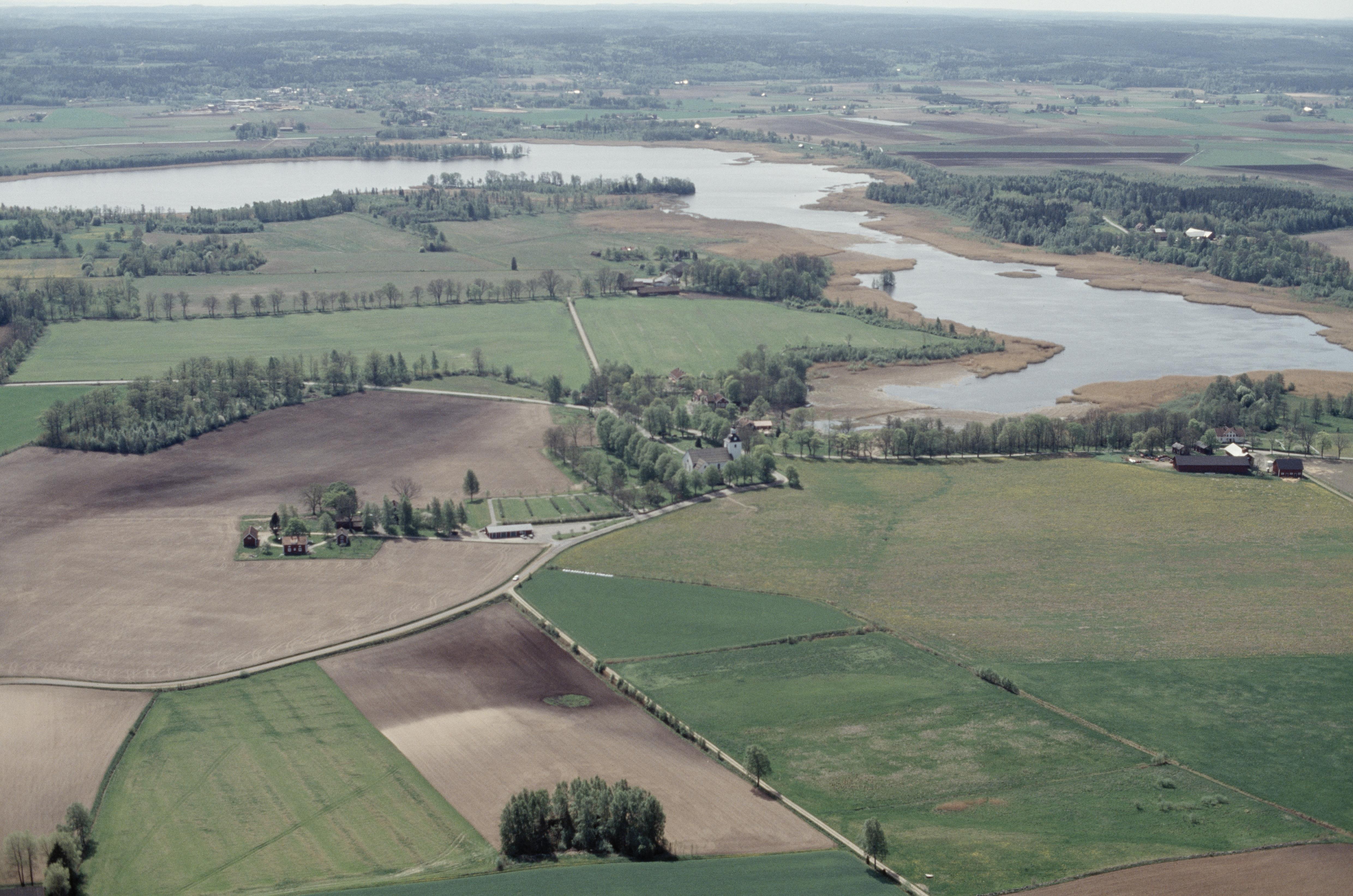 Beskrivning: Viby hembygdsgård, Viby kyrka och Viby gård vid Vibysjön. Bilden är tagen mot (väderstreck): S