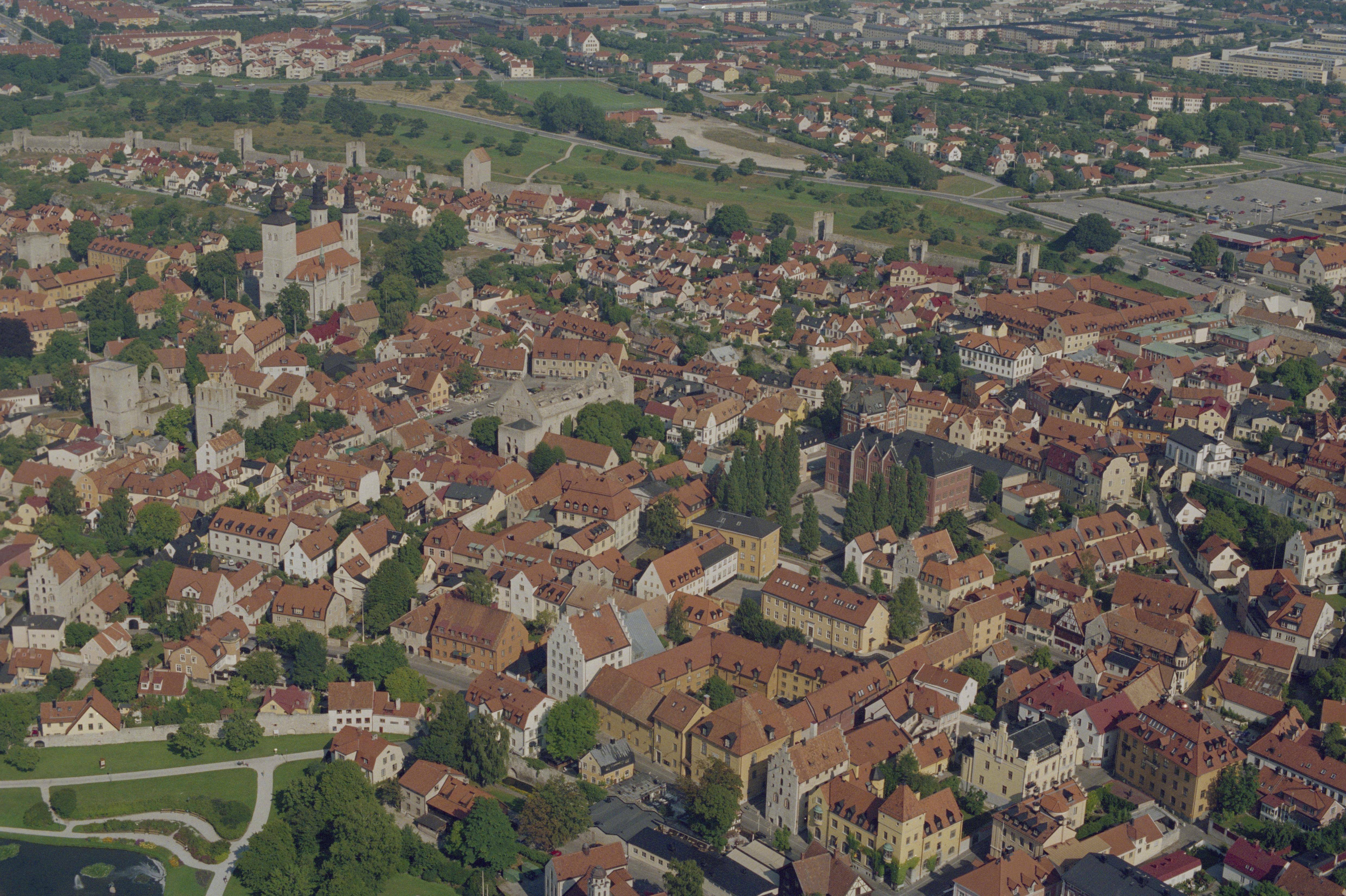 Beskrivning: Visby stad. Visby innerstad med Visby ringmur i stadslager RAÄnr Visby 107:1. Visby domkyrka uppe till vänster. Till vänster om bildens mitt kyrkoruinerna Drotten RAÄnr Visby 58:1 och Sankt Lars RAÄnr Visby 59:1. Vid bildens mitt Sankta Katarina RAÄnr Visby RAÄnr 57:1, Bilden är tagen mot (väderstreck): NO