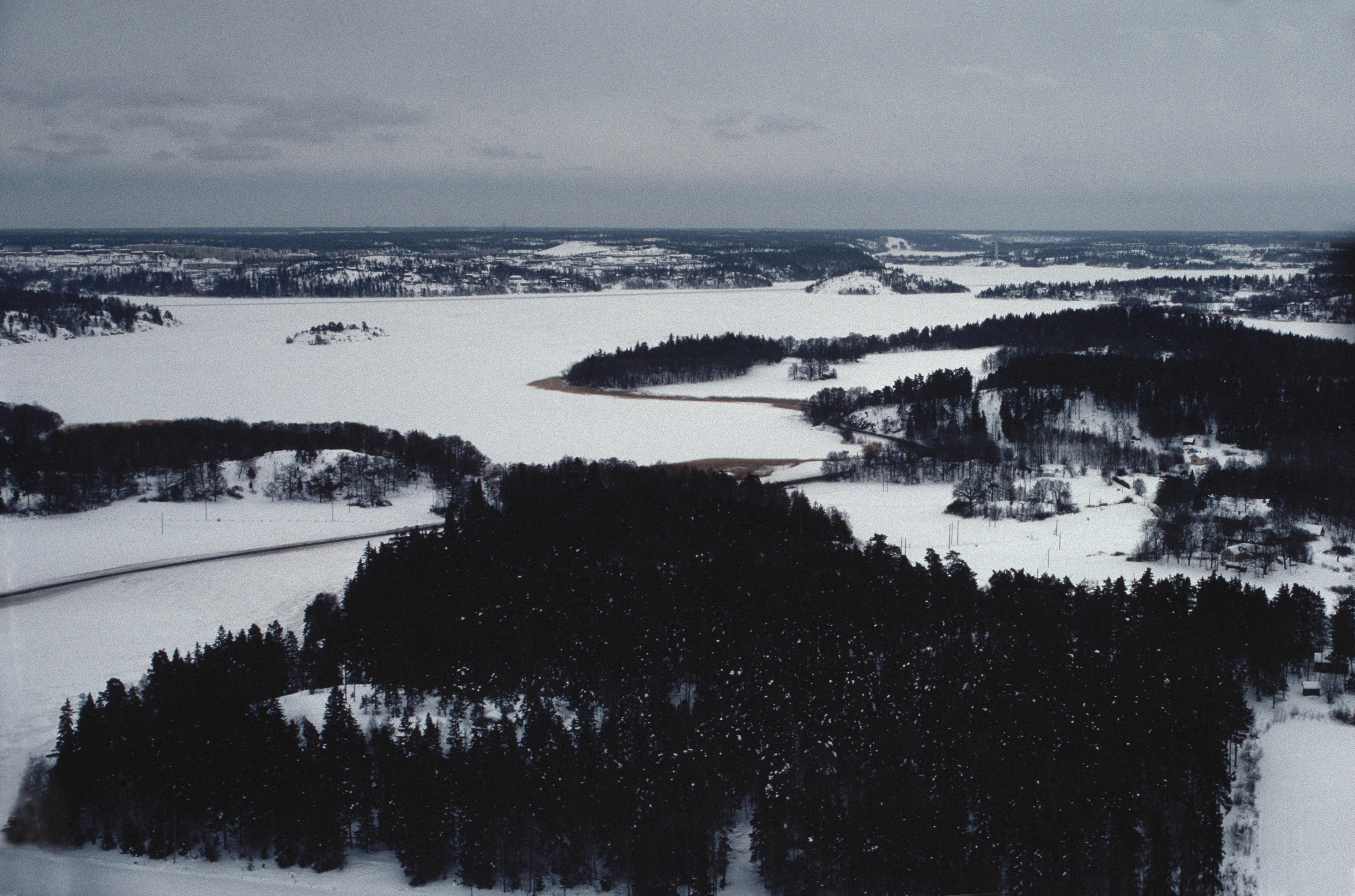 Beskrivning: Mälaren. Byn Kungsborg vid Boviken på ön Kungshatt i Fiskarfjärden. I bildens övre del öarna Ekerö och Estbröte i Ekerö socken. Bilden är tagen mot (väderstreck): SV