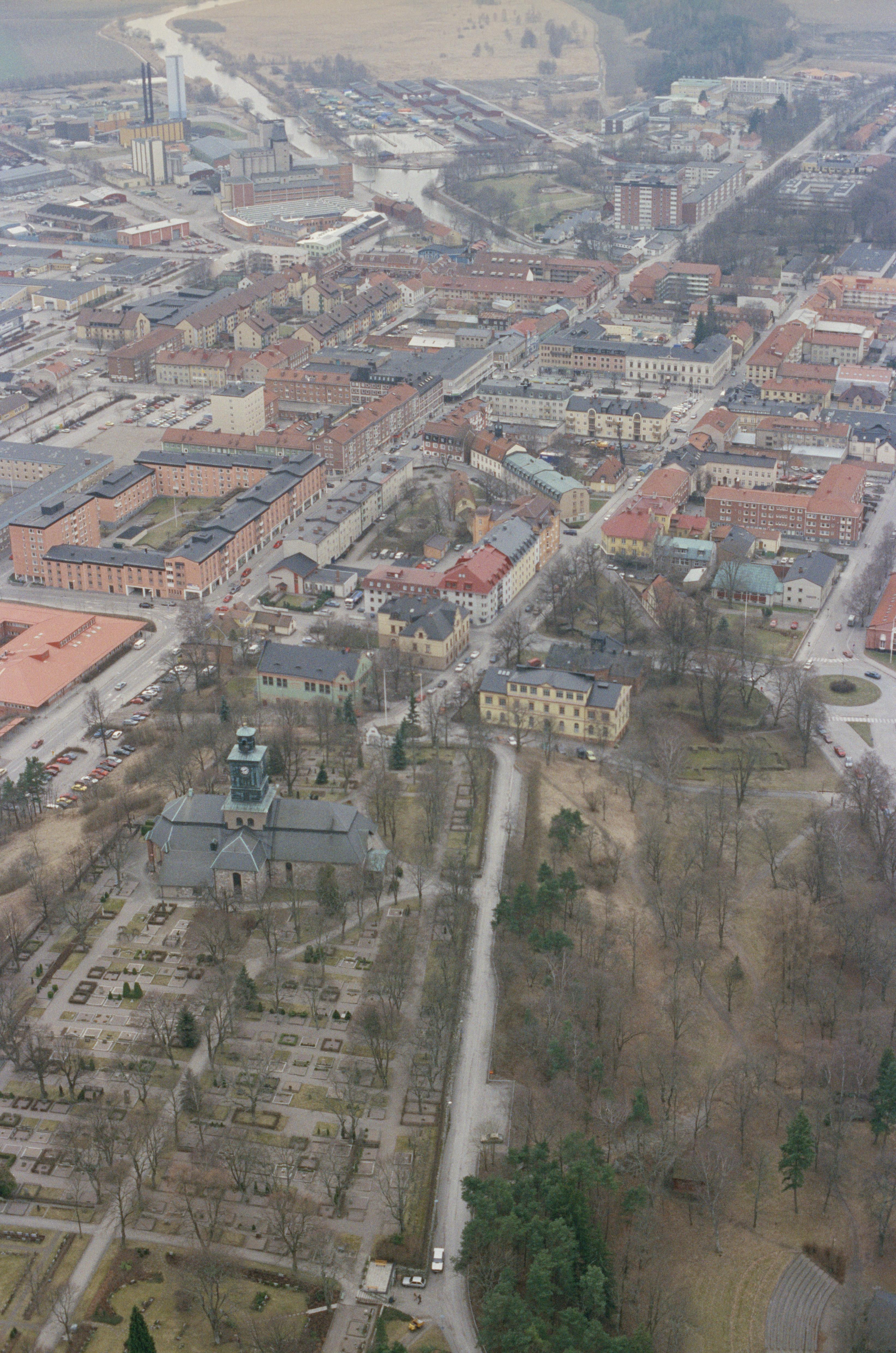 Beskrivning: Enköpings stad. Arkeologisk undersökning av stadslager RAÄnr Enköping 26:1 i kvarteret Borgmästaren (vid bildens mitt). I bildens nedre del Vårfrukyrkan. Bilden är tagen mot (väderstreck): S