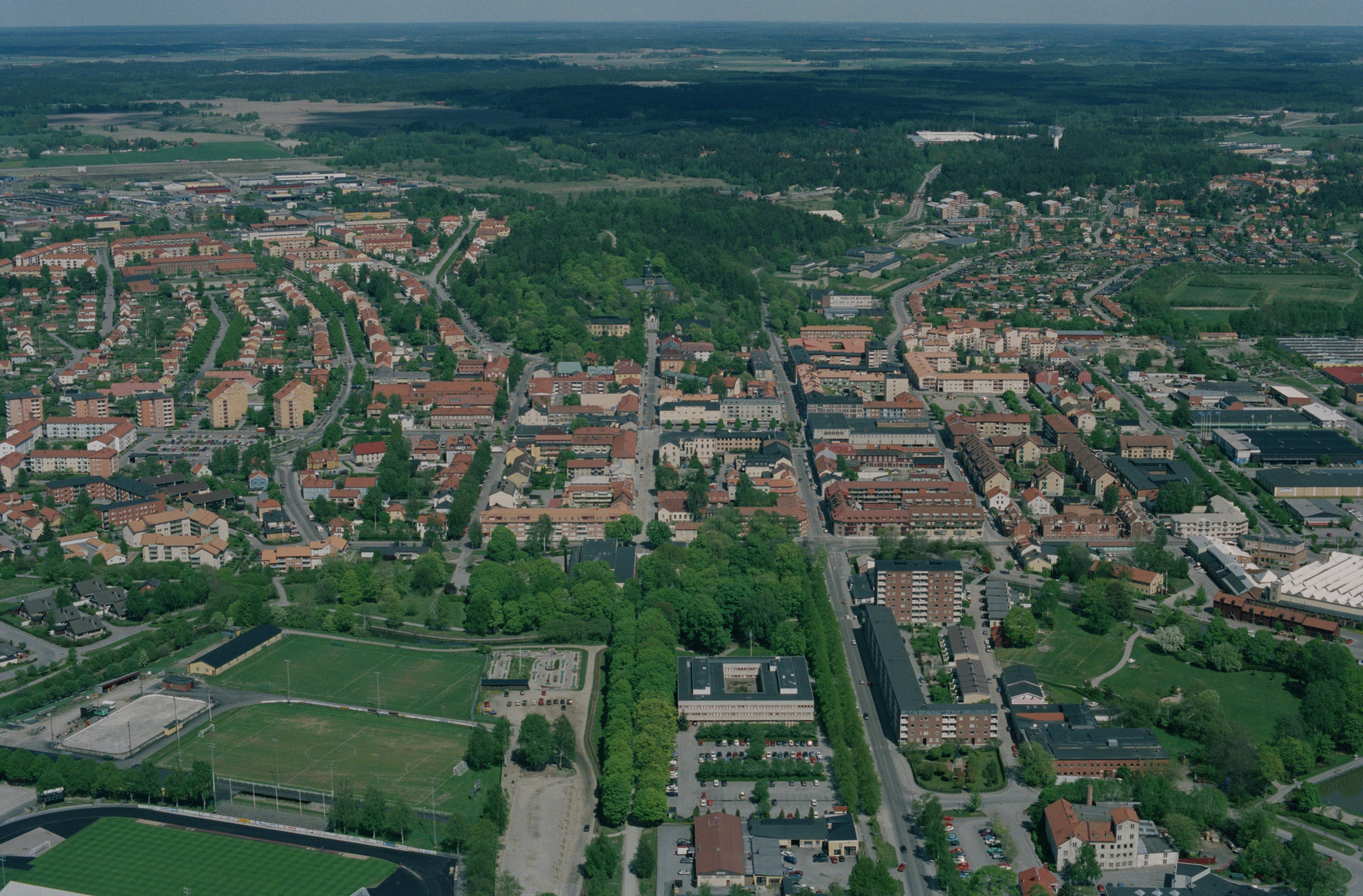 Beskrivning: Enköpings stad. Vårfrukyrkan över bildens mitt. Bilden är tagen mot (väderstreck): NO