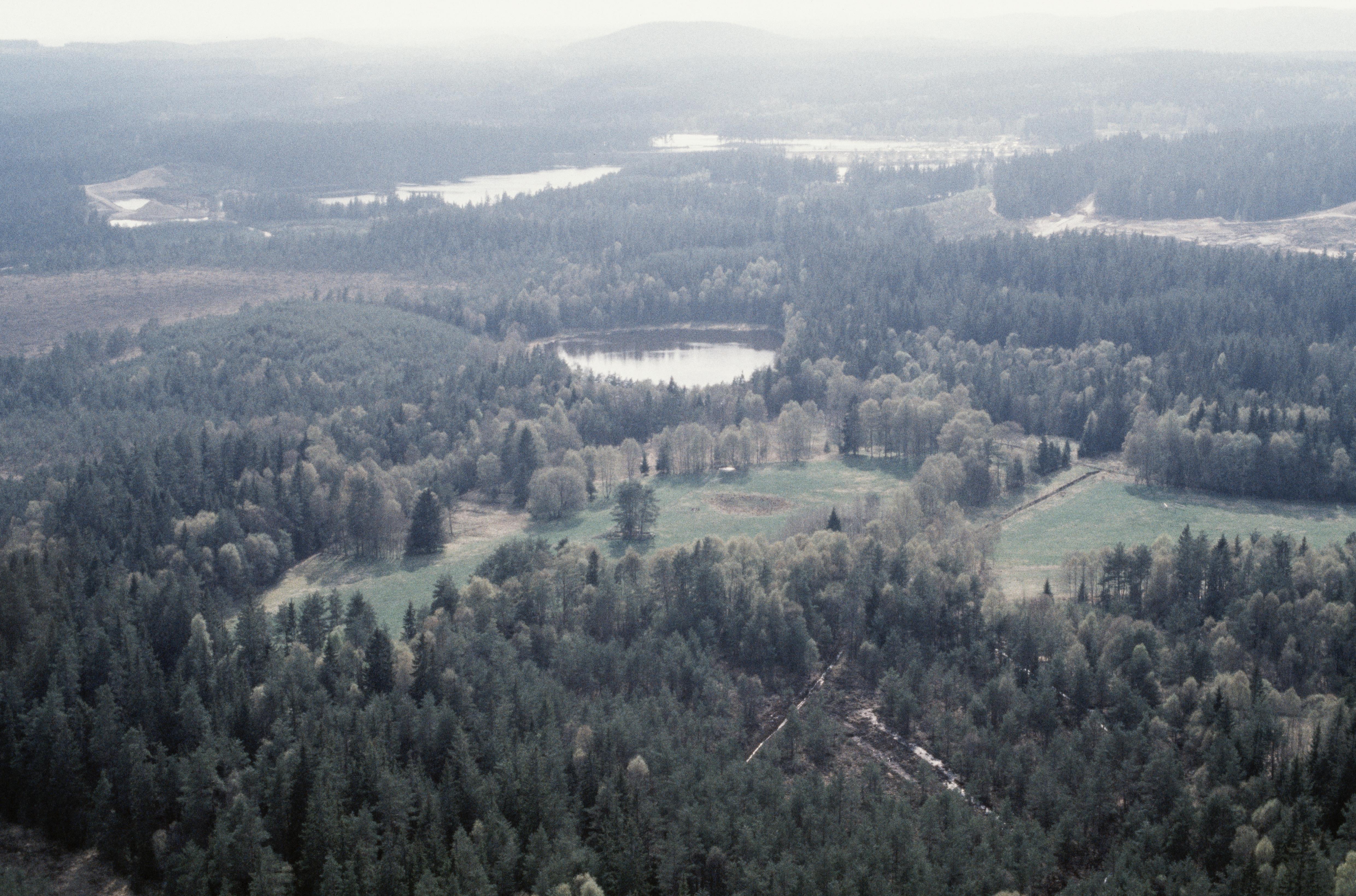 Beskrivning: Rödjordsområde vid Sjöryd och Store Mossen. Gransjön och Björkesjö. Lägenhetsbebyggelse RAÄnr Tranemo 282:1. I bildens övre del kolningsanläggning RAÄnr Tranemo 303:1. Bilden är tagen mot (väderstreck): S