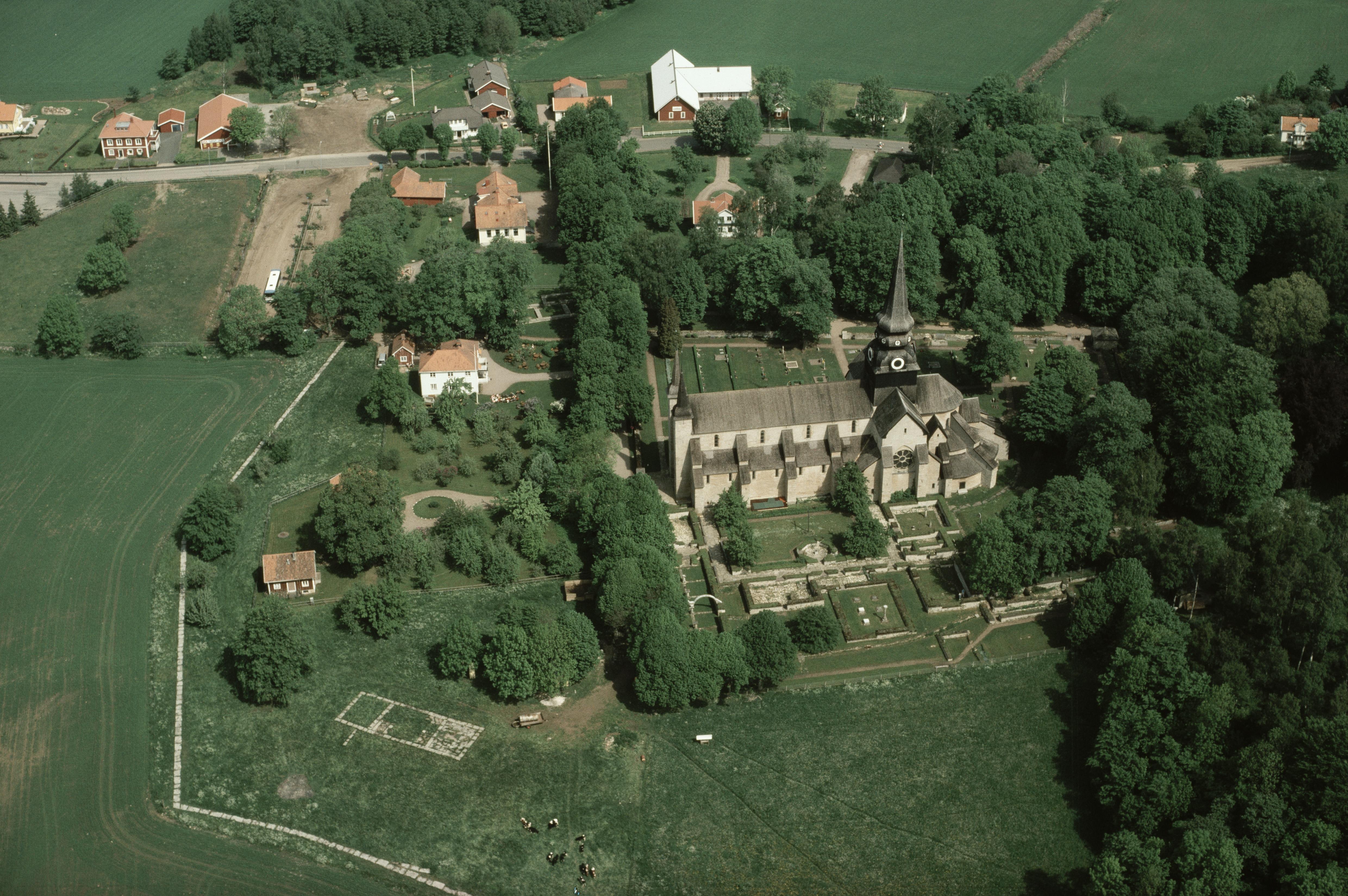 Beskrivning: Varnhems klosterkyrka (skrivs även Varnhems kyrka) och ruinen Varnhems kloster RAÄnr Varnhem 94:1. Bilden är tagen mot (väderstreck): N