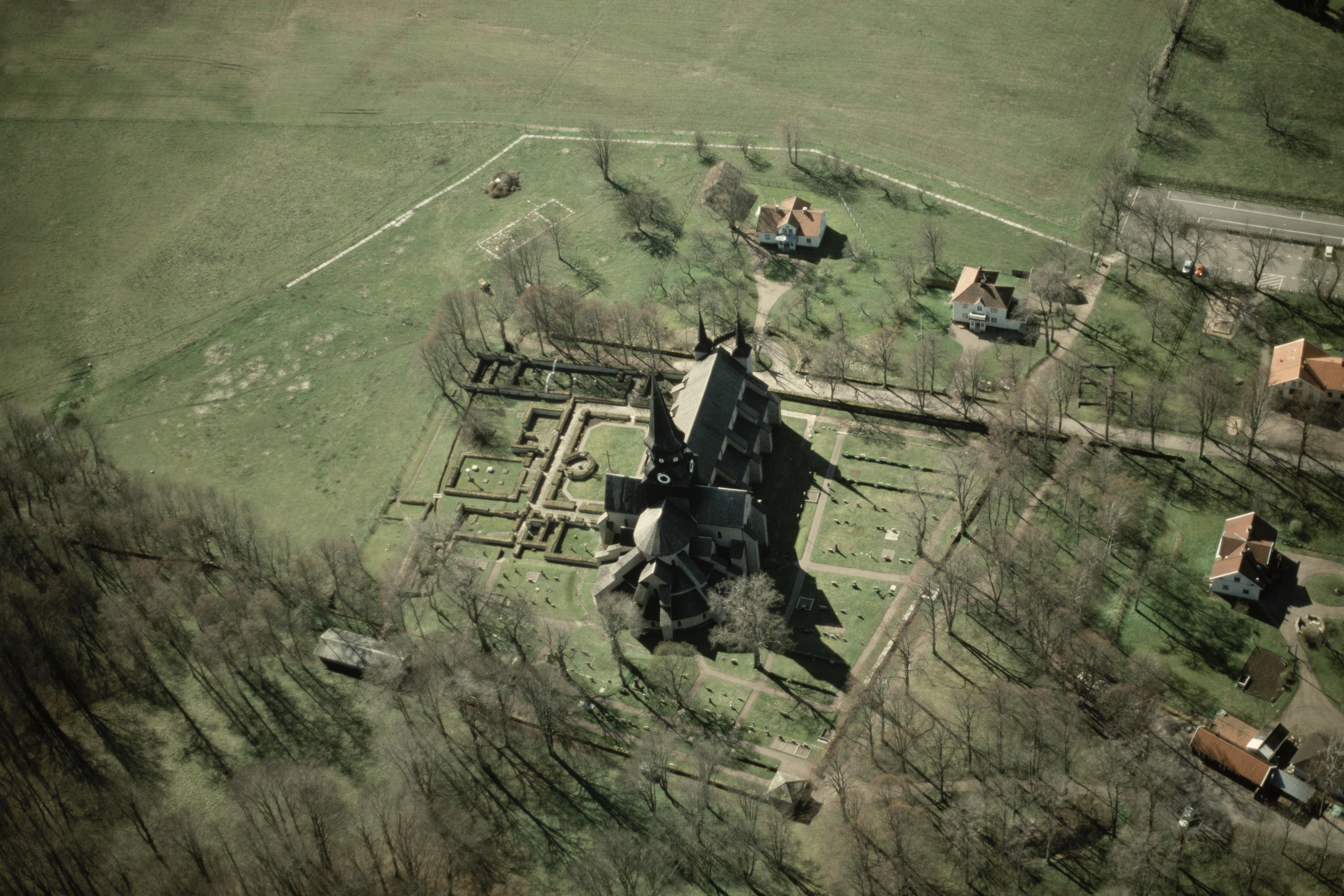 Beskrivning: Varnhems klosterkyrka (skrivs även Varnhems kyrka) och ruinen Varnhems kloster RAÄnr Varnhem 94:1. Bilden är tagen mot (väderstreck): VSV