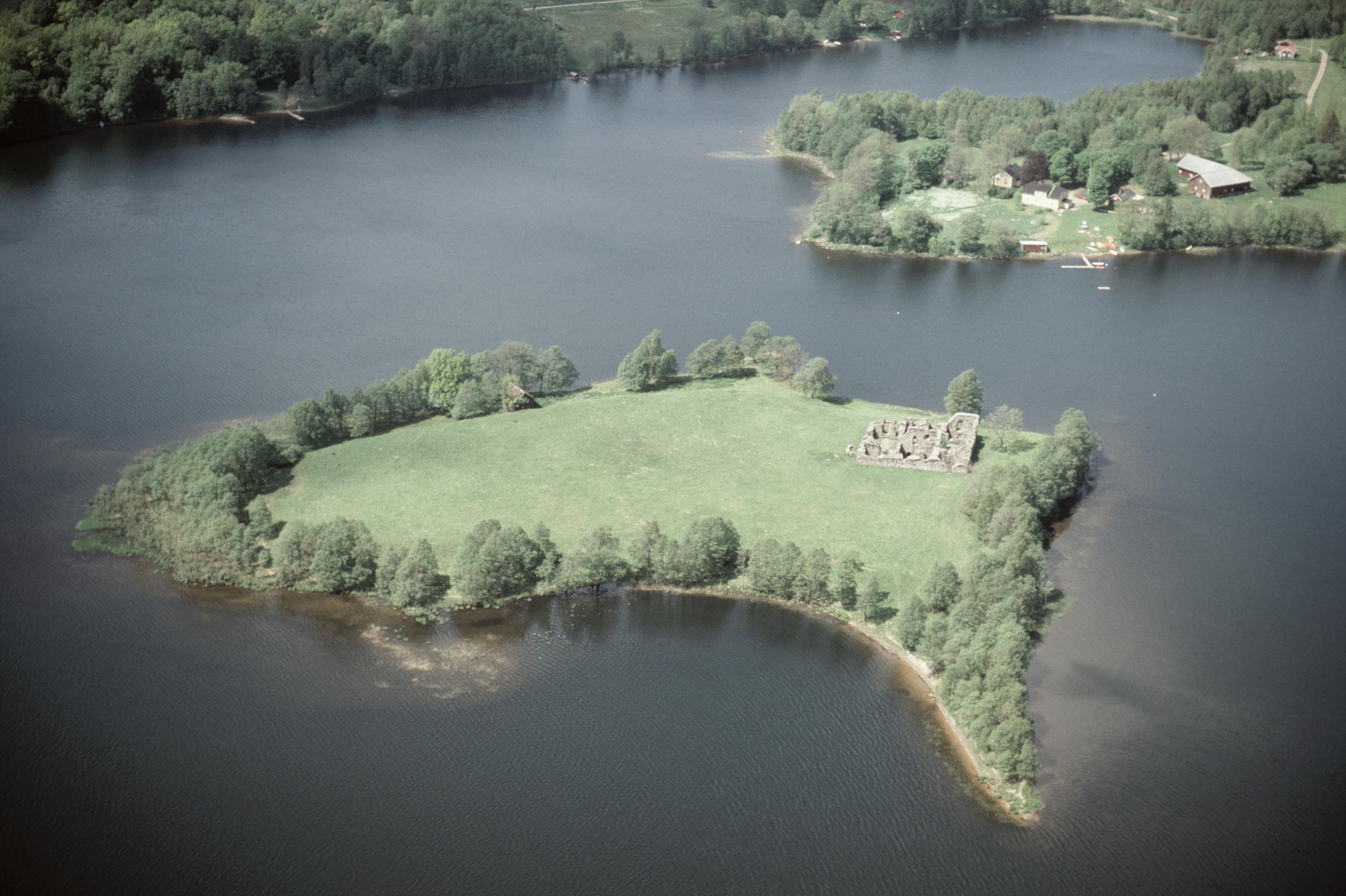 Beskrivning: Husgrunder och Sundholmens slottsruin RAÄnr Äspered 2:1-4 på Holmen i sjön Tolken. Bilden är tagen mot (väderstreck): N