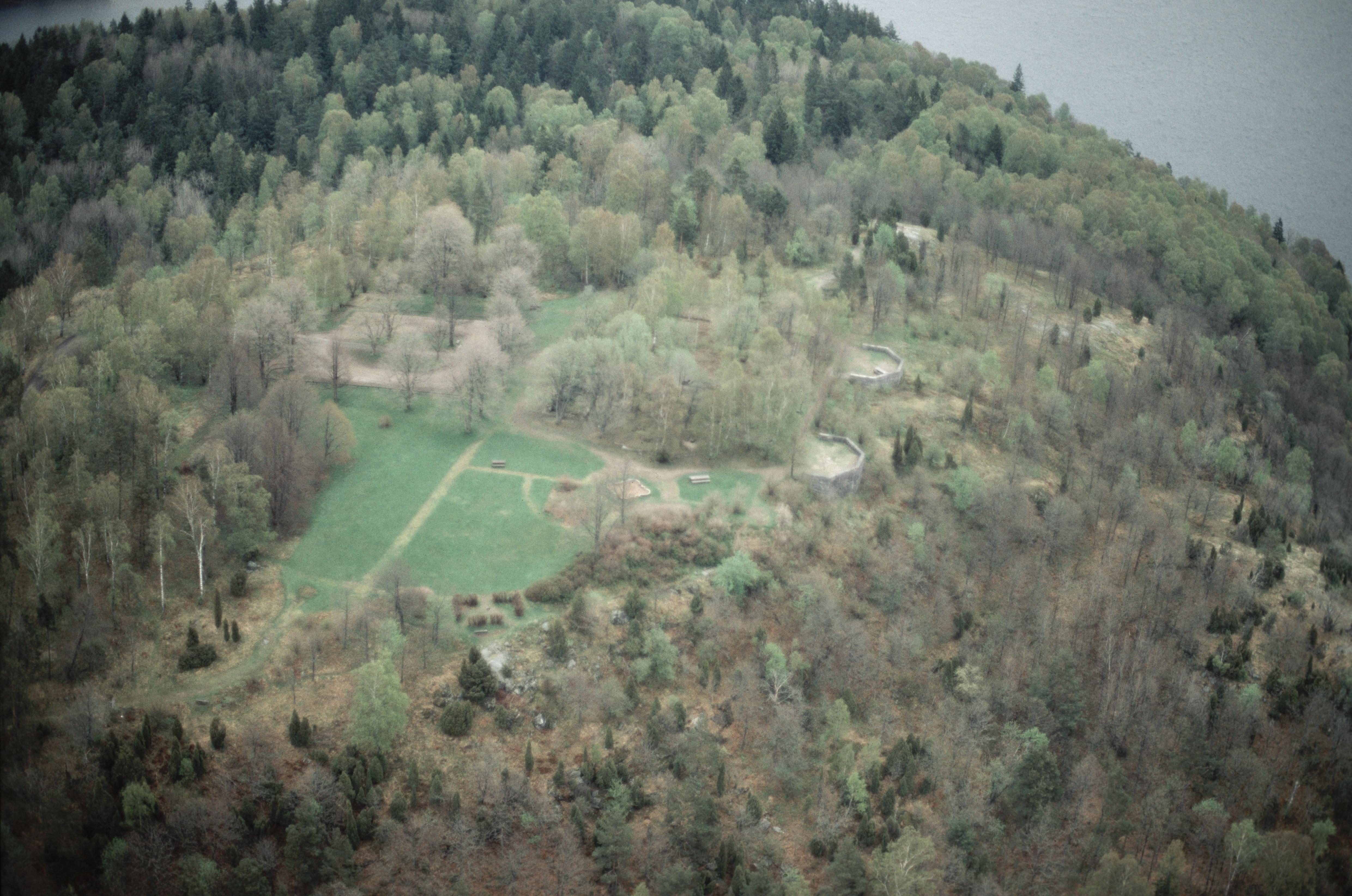 Beskrivning: Hyltenäs slottsruin / Seatons kulle RAÄnr Öxnevalla 32:1 på en udde mellan Västra och Östra Öresjön. Bilden är tagen mot (väderstreck): NO