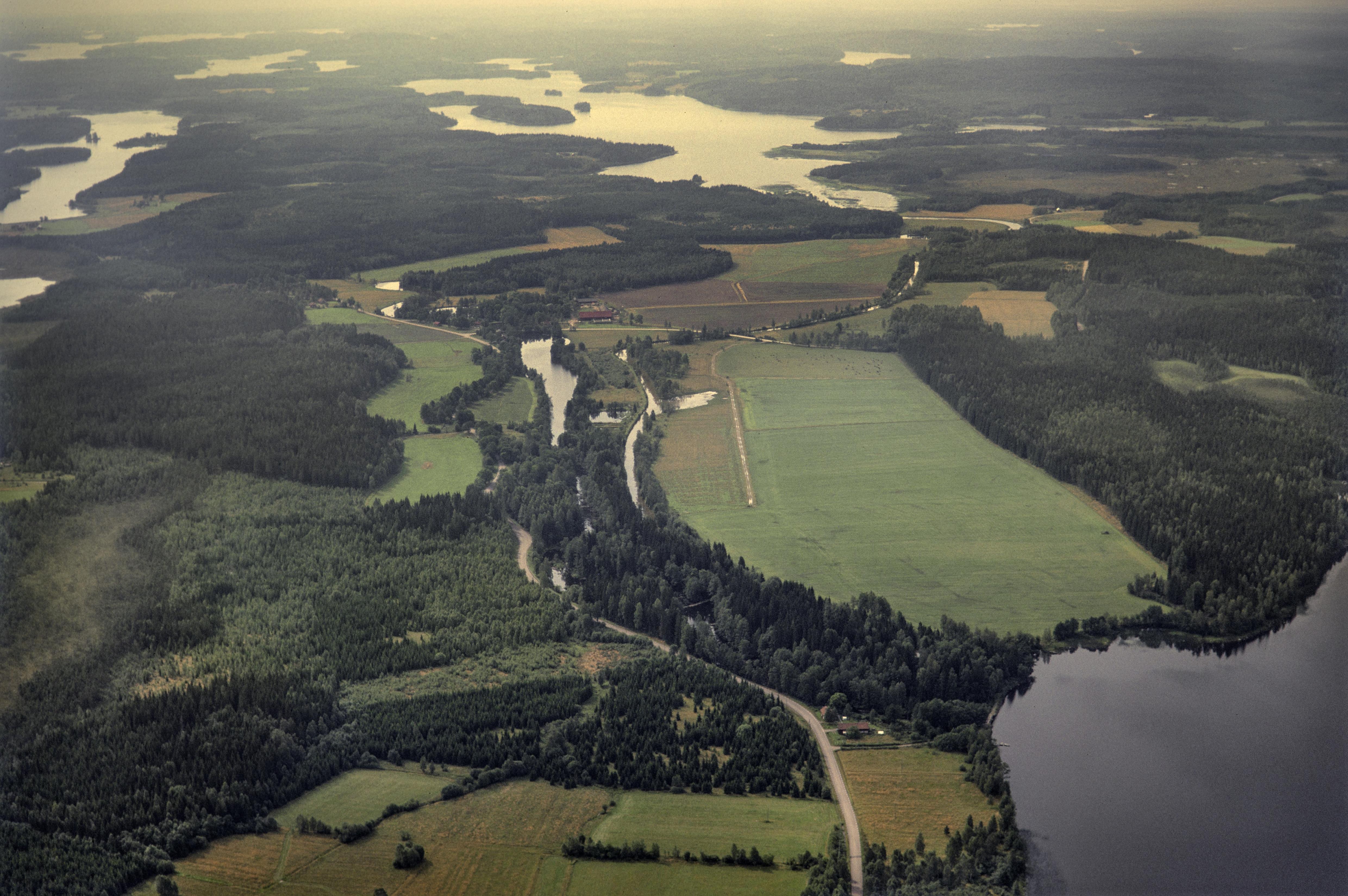 Beskrivning: Bjurbäckskanalen och Bjurbäcksälven mot sjön Stor-Lungen. Vid bildens mitt Källsfallet och över bildens mitt hammarområde RAÄnr Lungsund 20:1. I bildens nedre del Aspsjön och gränsen mot Färnebo socken. Bilden är tagen mot (väderstreck): SSV