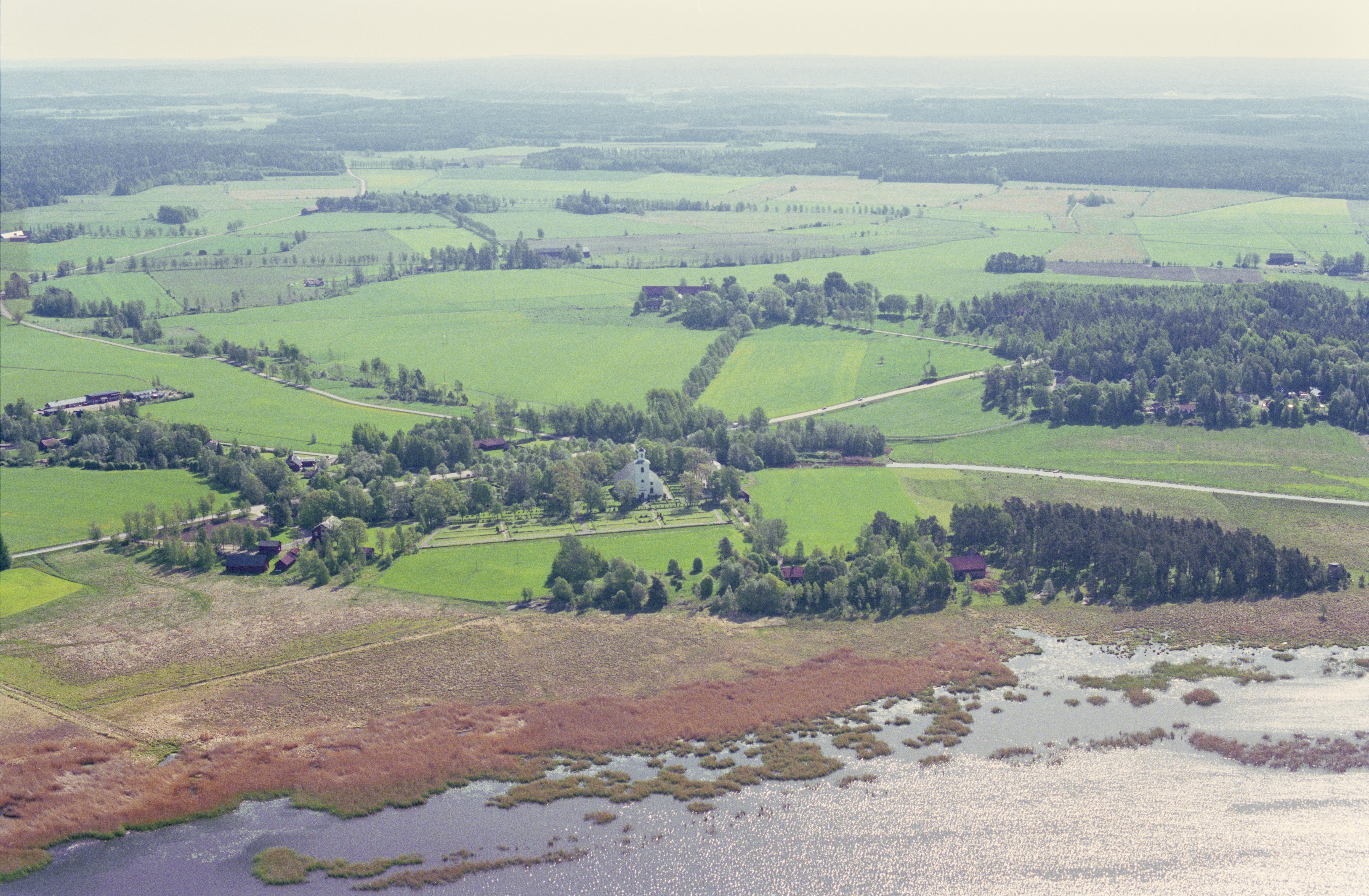 Beskrivning: Väse kyrka. Till höger ön Glummans utlopp i sjön Panken. Bilden är tagen mot (väderstreck): Ö