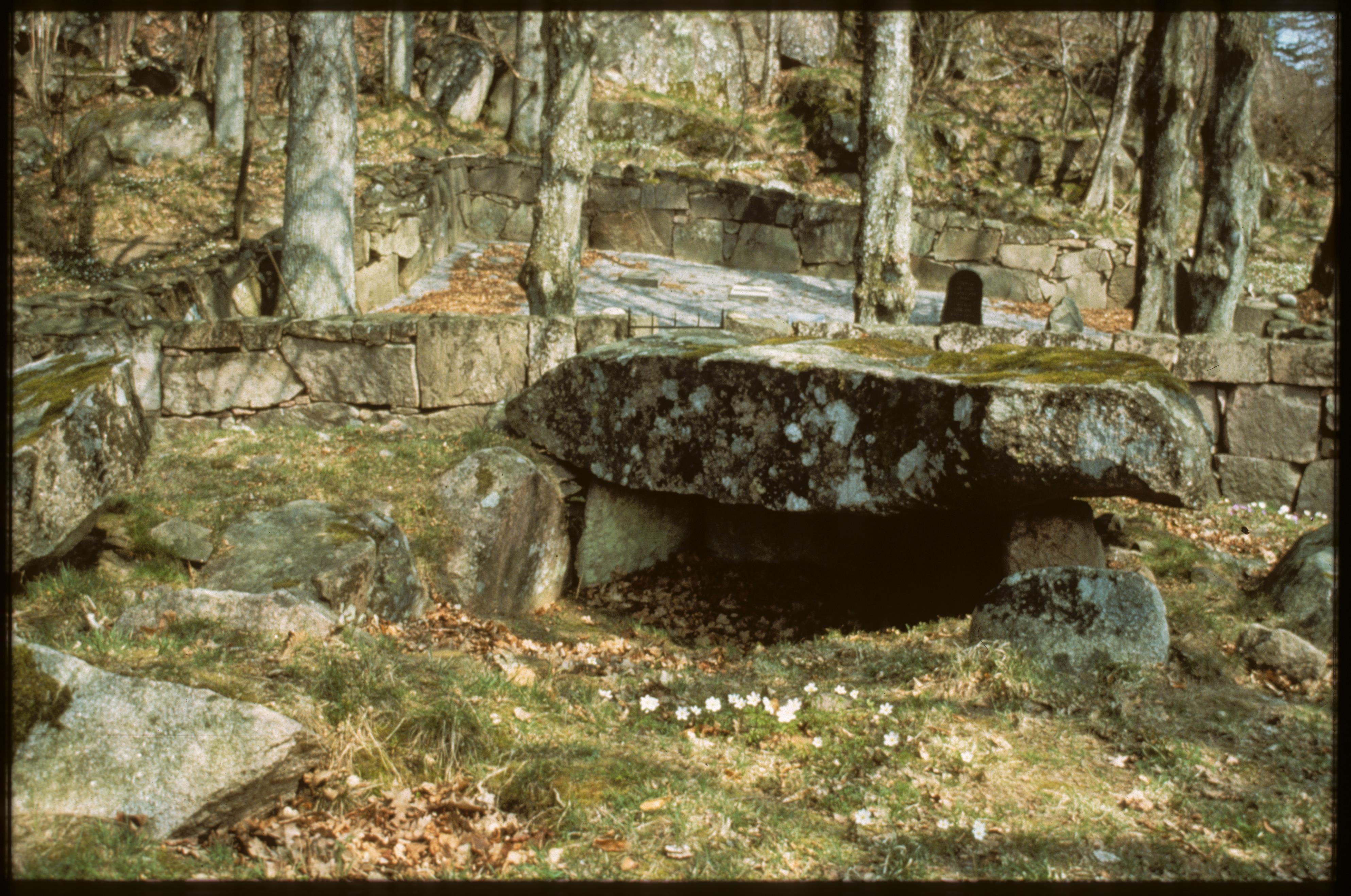 Beskrivning: Gånggrift i hög. "Glos altare". Tossene 157:1.